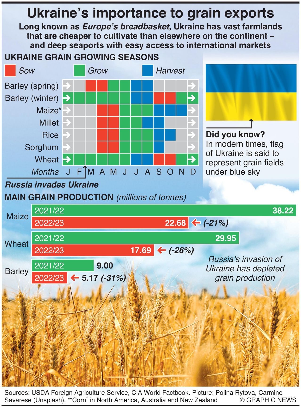 According to the Food Agriculture Organization of the United Nations, last year Ukraine exported 20 million tonnes of wheat, 5 million tonnes of barley, and 25 million tonnes of maize (aka corn).