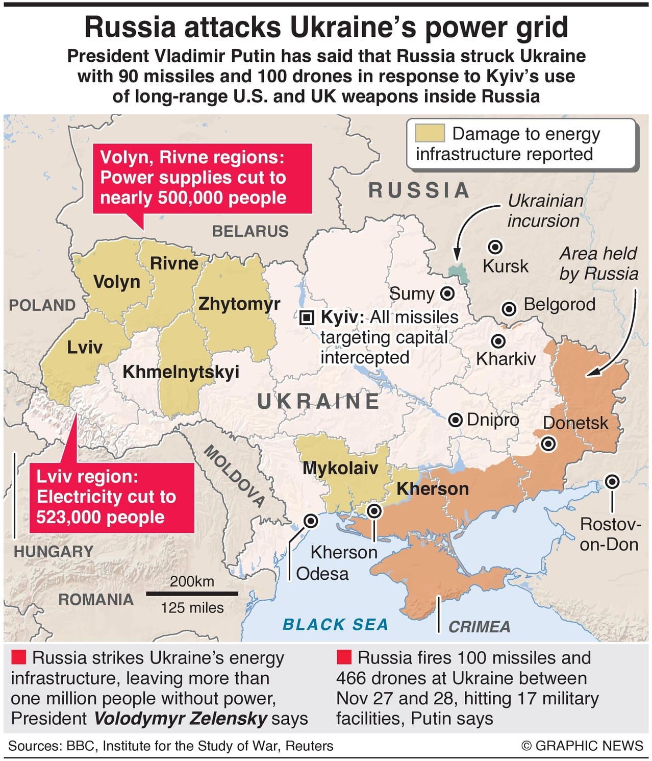 Power was also cut to nearly 500,000 people in the Volyn and Rivne regions, their governors said, and disrupted in the Khmelnytskyi and Zhytomyr regions.