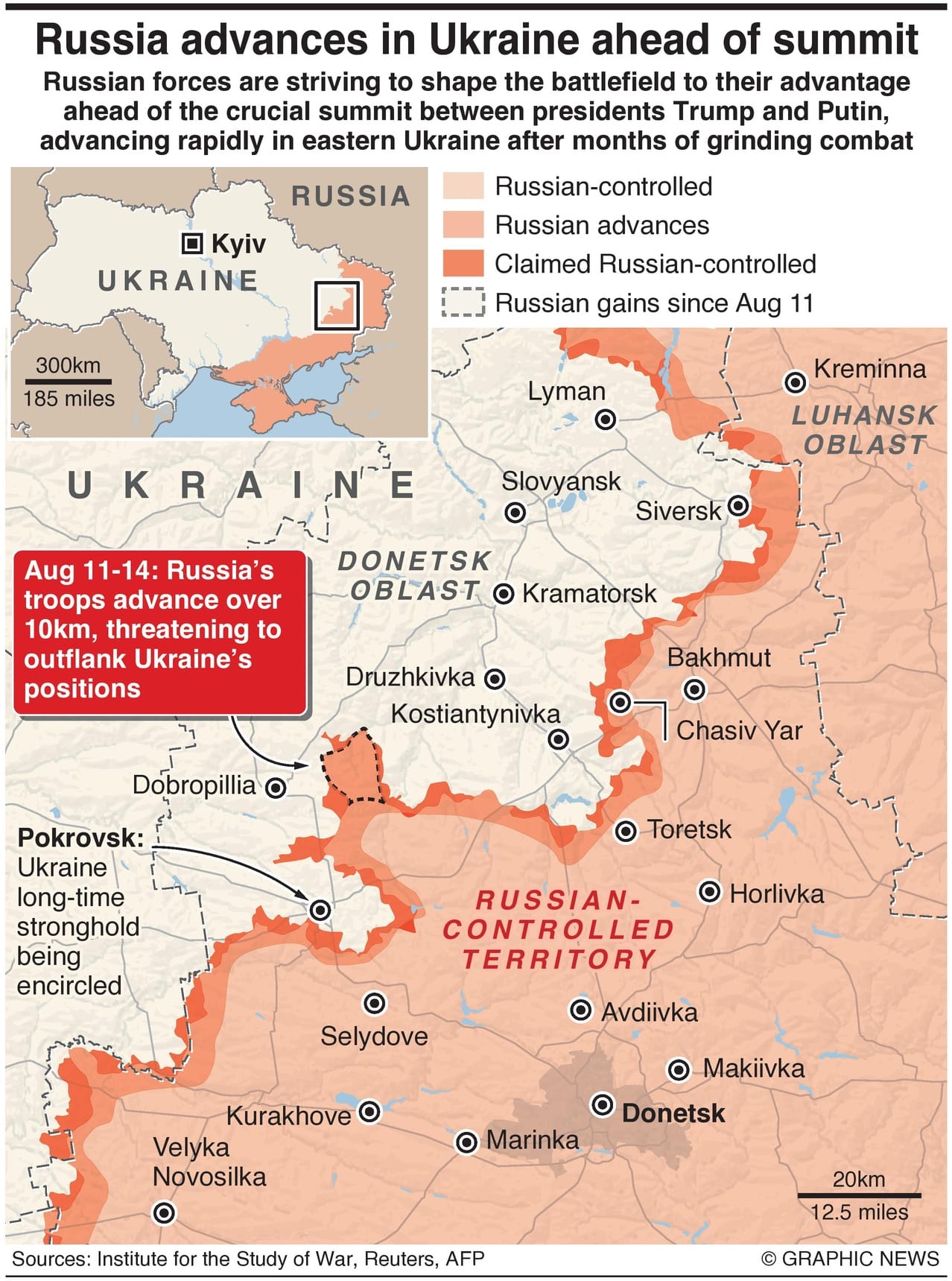 Russian forces are striving to shape the battlefield to their advantage ahead of the crucial summit between Presidents Trump and Putin, advancing rapidly in eastern Ukraine after months of grinding combat.
