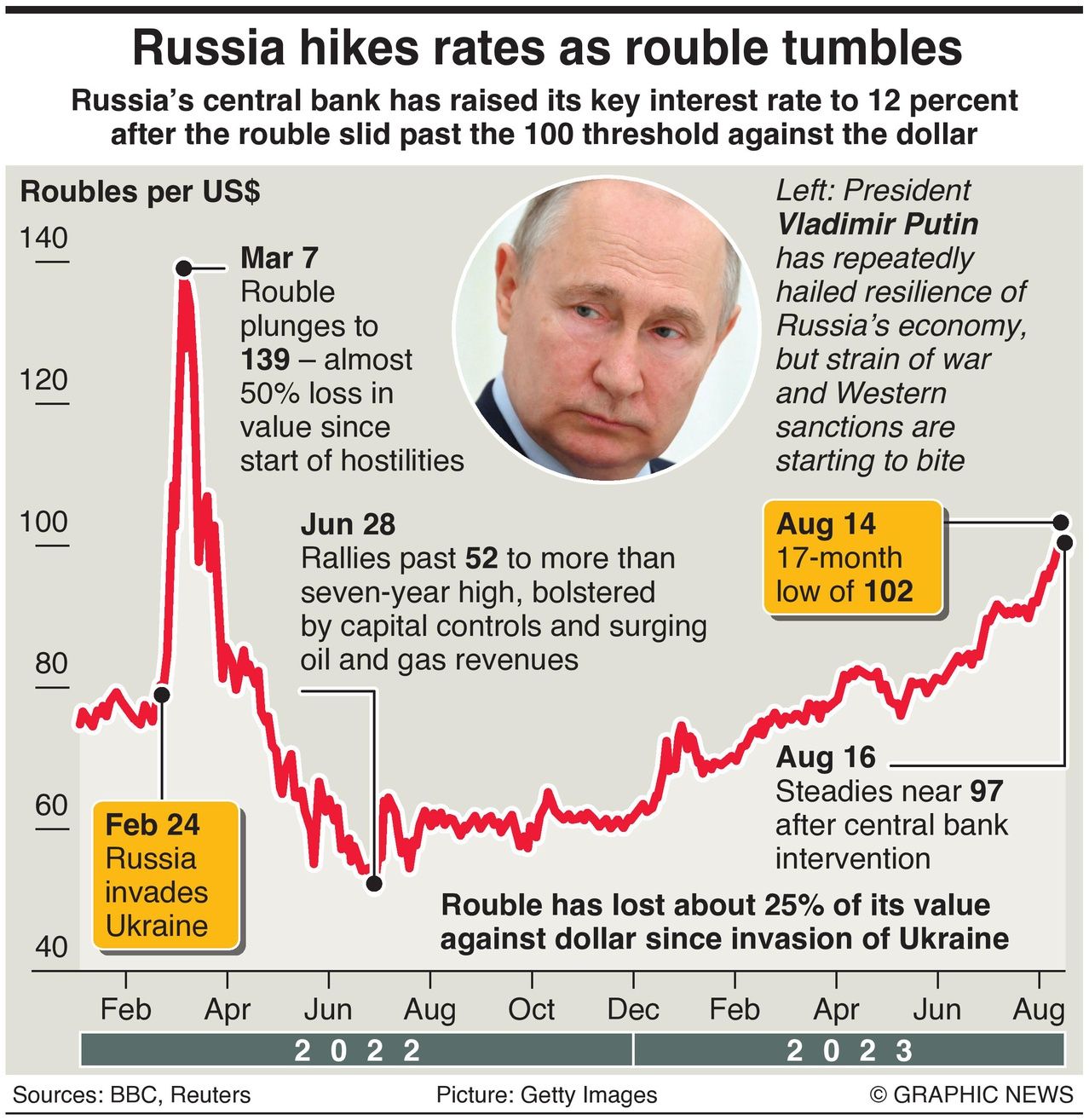 Russia’s central bank has raised its key interest rate 3.5 percentage points to 12 percent, after the rouble slid past 100 against the dollar for the first time since March last year.