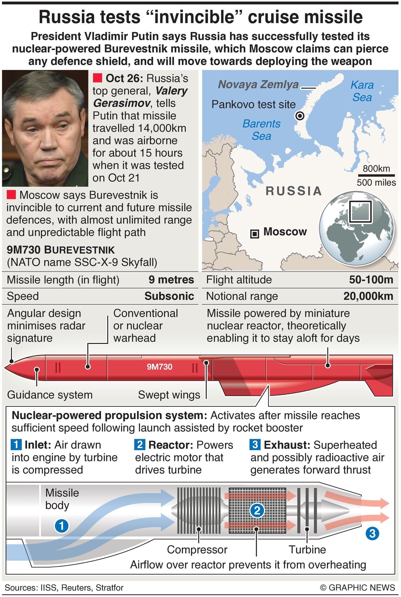 Russia says the 9M730 Burevestnik (Storm Petrel) – dubbed the SSC-X-9 Skyfall by NATO – is “invincible” to current and future missile defences, with an almost unlimited range and unpredictable flight path, according to Reuters.