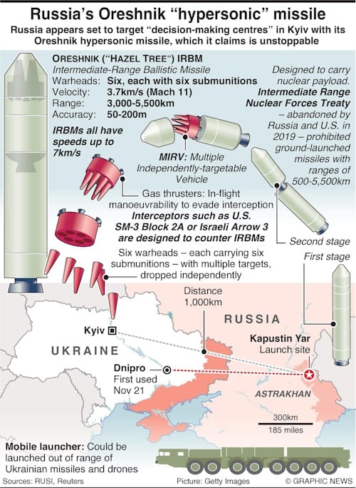The Oreshnik, which appears to be based on the RS-26, an Intermediate Range Ballistic Missile designed to carry a nuclear payload up to 5,500km. IRBMs were prohibited under the Intermediate Range Nuclear Forces Treaty, but both Russia and the U.S. abandoned the INF in 2019 claiming violations by the other side.