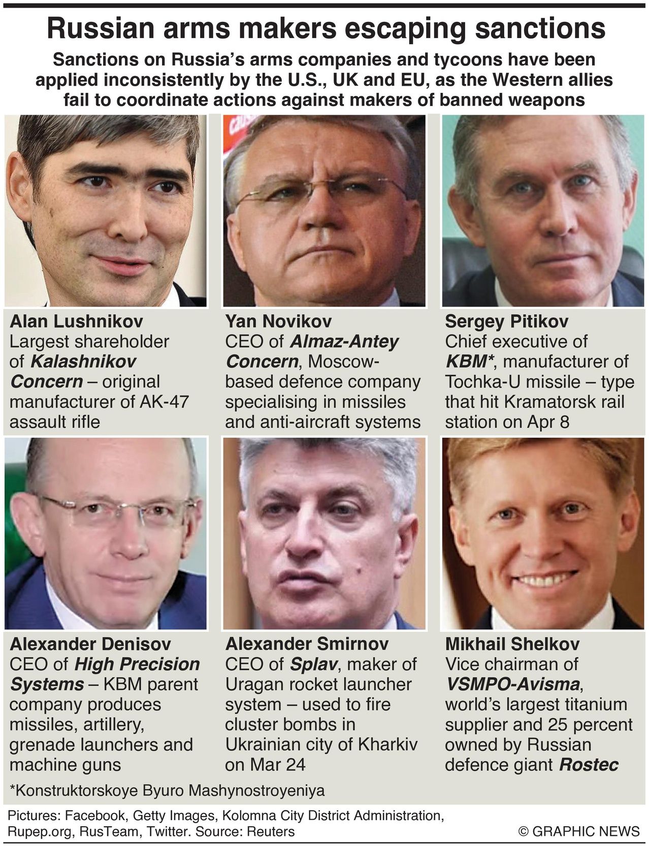 But a Reuters examination of companies, executives, and investors underpinning Russia's defense sector shows a sizable number of players have yet to pay a price: Nearly three dozen leaders of Russian weapons firms and at least 14 defense companies have not been sanctioned by the United States, the European Union or the United Kingdom. In addition, sanctions on Russia’s arms makers and tycoons have been applied inconsistently by these NATO allies, with some governments levying penalties and others not, the Reuters review showed.