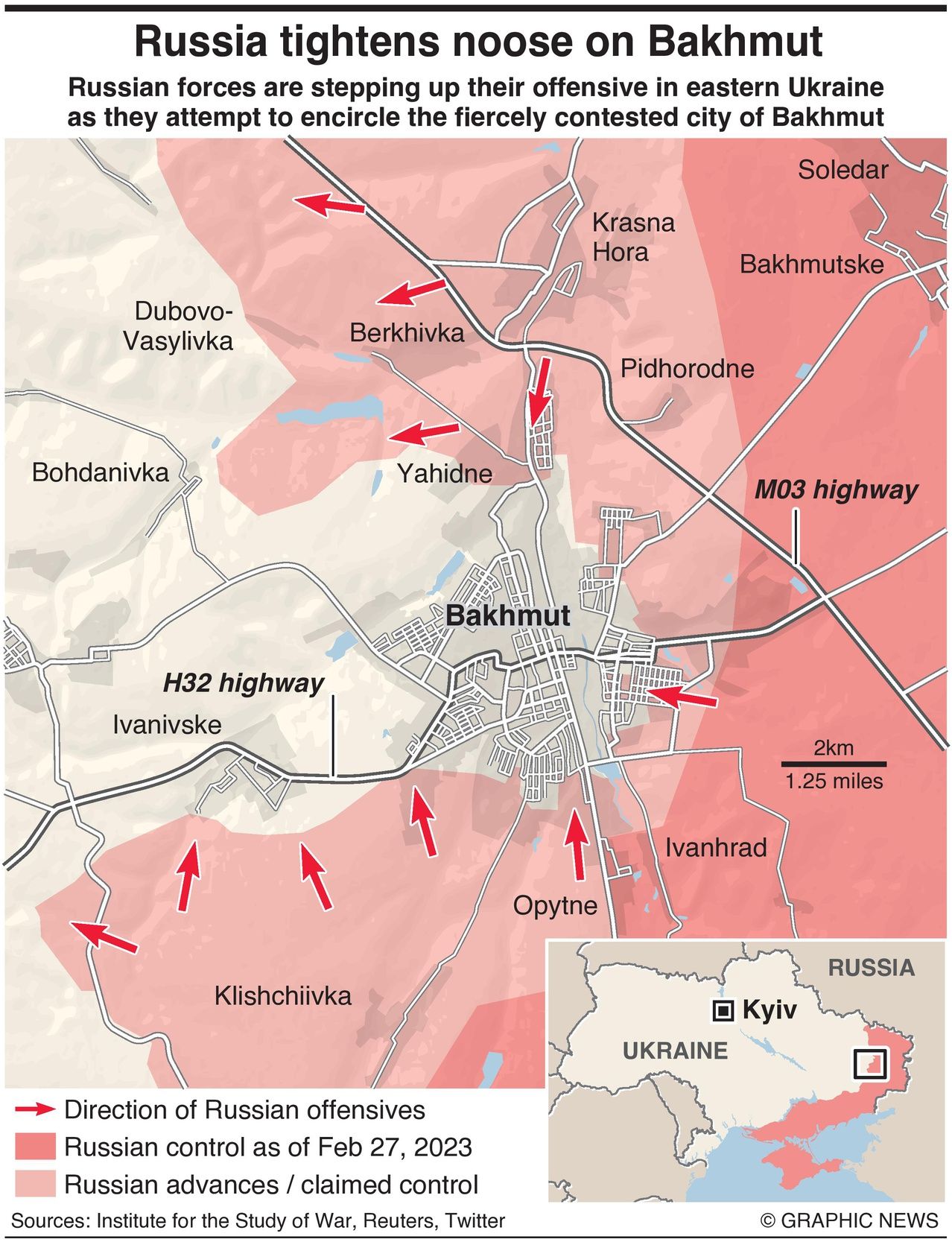 Capturing Bakhmut, scene of some of the war’s bloodiest battles, would be Russia’s first major prize in more than six months and open the way for taking the last remaining urban centres in the Donetsk region, one of four Moscow claims to have annexed in its ”special military operation” in Ukraine.