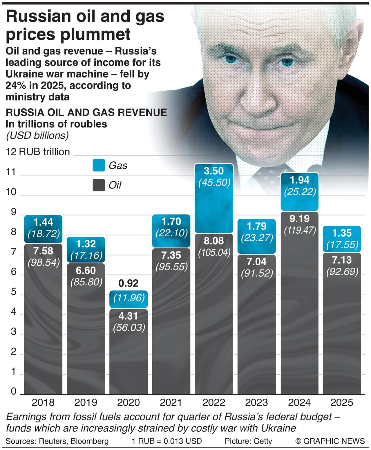 Oil and gas revenue – Russia’s leading source of income for its Ukraine war machine – fell by 24% in 2025, according to data from its own Finance Ministry.