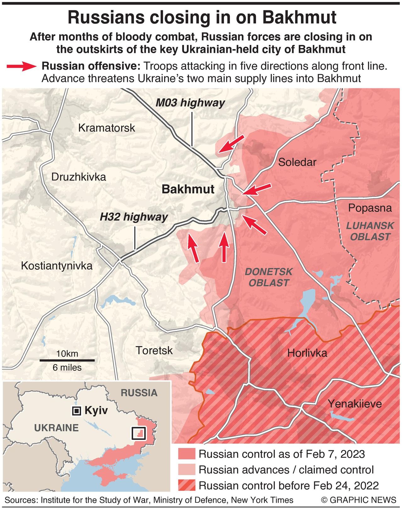 Russian forces are attacking the Ukrainian city of Bakhmut from five directions, with regular troops and fighters from the Wagner mercenary group closing in on the outskirts.