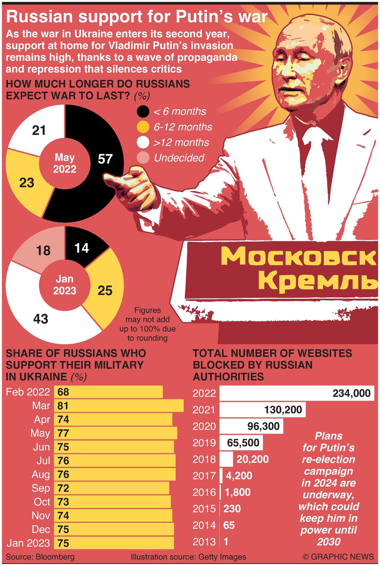 As the war in Ukraine enters its second year, support at home for Vladimir Putin’s invasion remains high, thanks to a wave of propaganda and repression that silences critics.