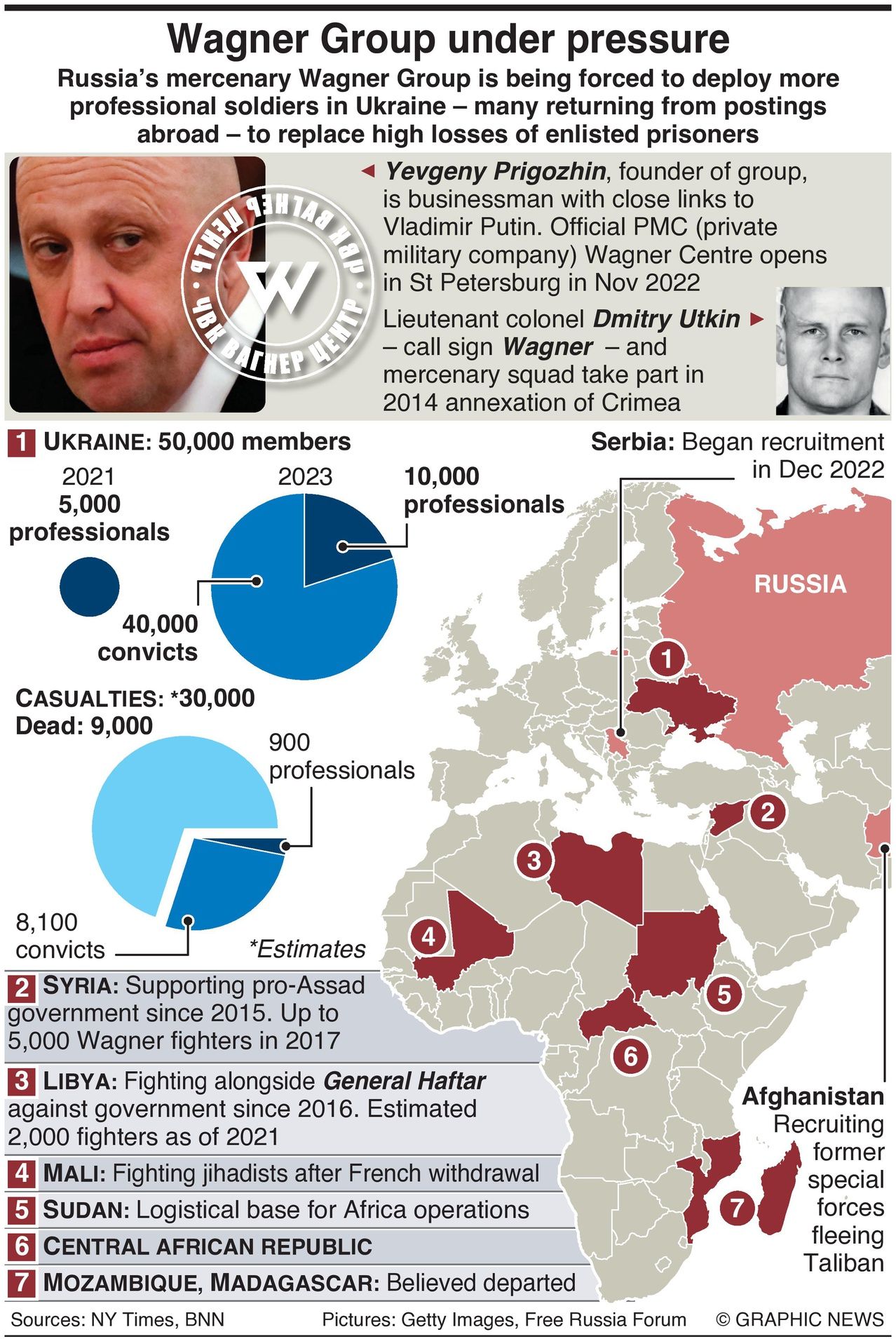 Since the beginning of the Ukraine war however, many of the contractors in Africa returned to Russia and, to boost numbers, the group began to recruit Russian prisoners for frontline duty in exchange for a presidential pardon and a salary of 100,000 rubles. The composition of its membership has changed from being almost exclusively military veterans and professional soldiers, but being largely untrained and with poor discipline, the fatalities have been disproportionately borne by these convict recruits.