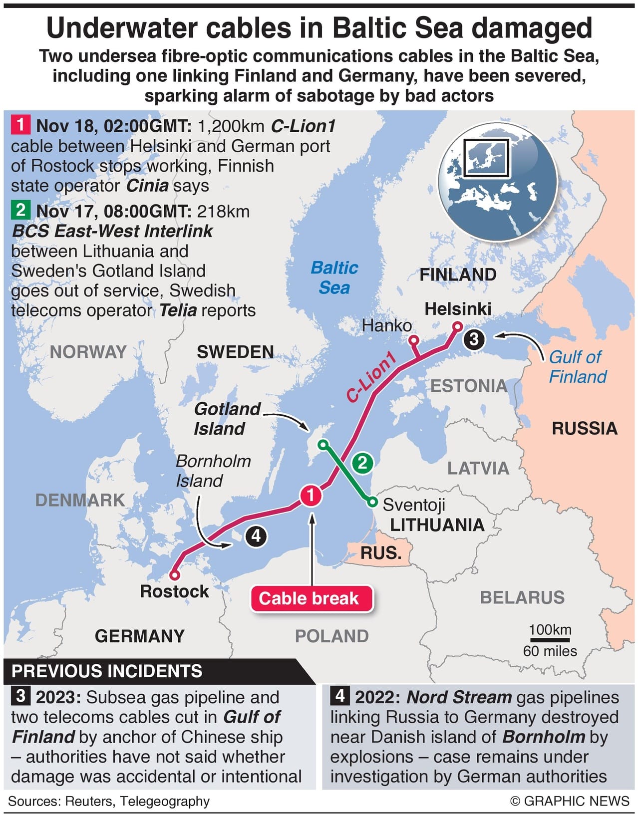 Separately, Swedish telecoms operator Telia said that a communications cable between Sweden and Lithuania was damaged on Sunday morning, almost 24 hours before the Finnish-German severing.