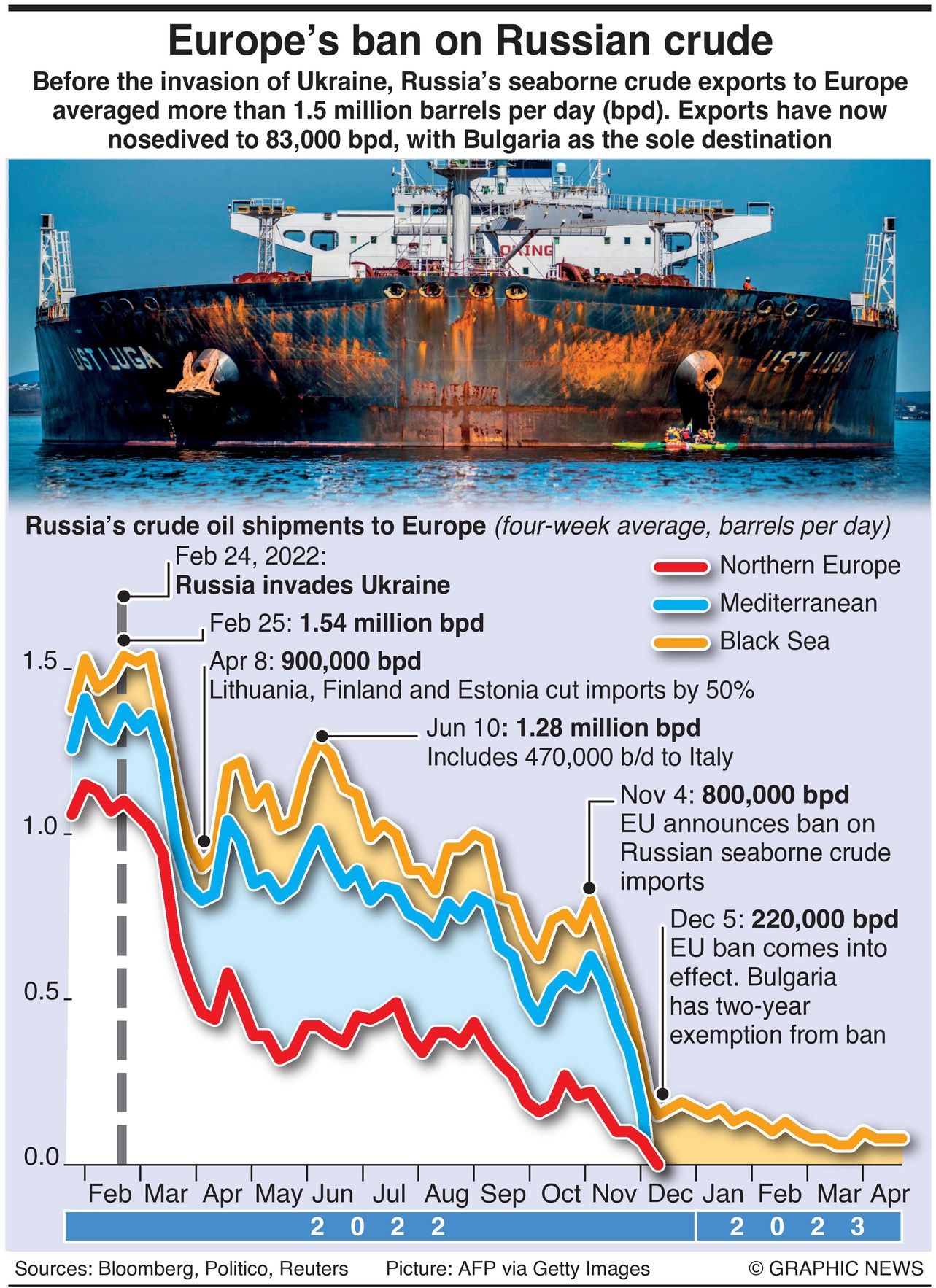 Before the invasion of Ukraine, Russia’s seaborne crude exports to Europe averaged more than 1.5 million barrels per day (bpd). Exports have now nosedived to 83,000 bpd, with Bulgaria as the sole destination.