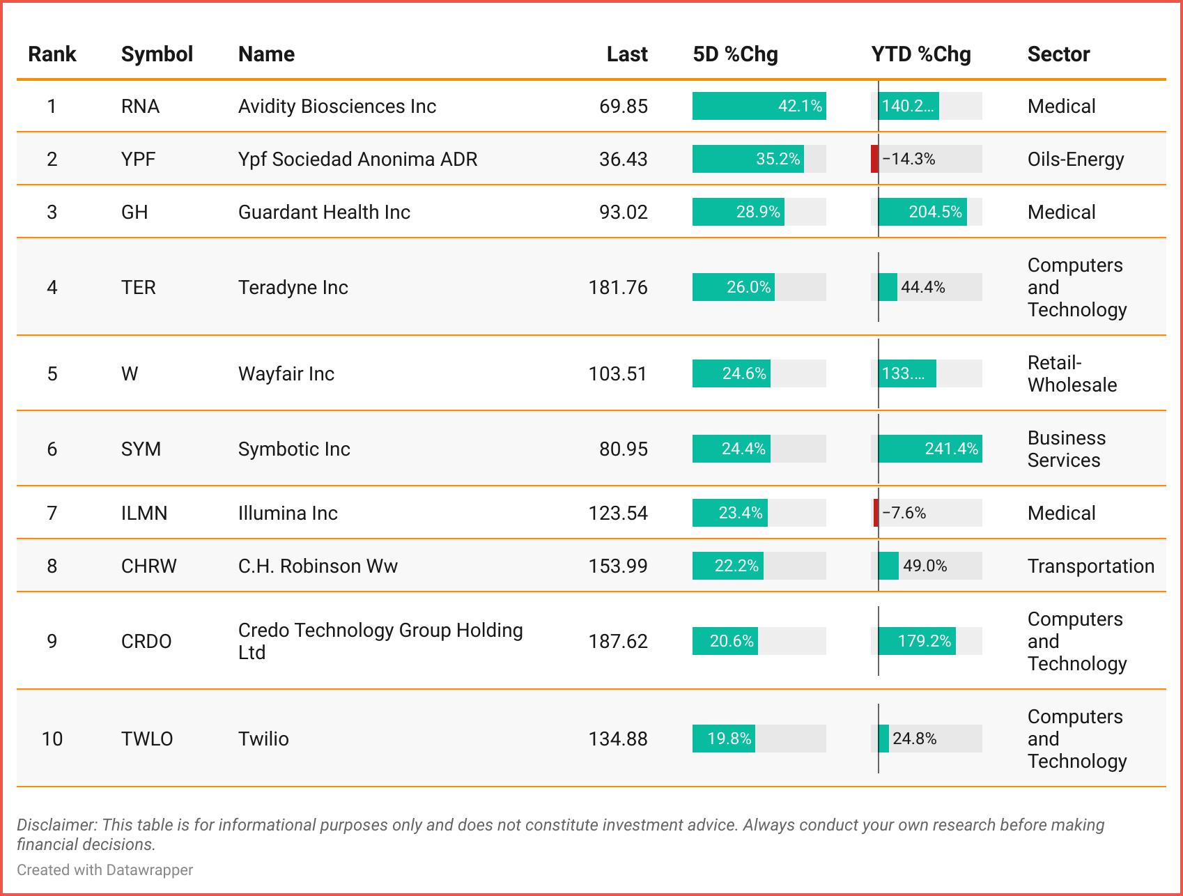 A data-driven look at the week’s 10 best-performing stocks — all trading above $20 with over 1M in volume.