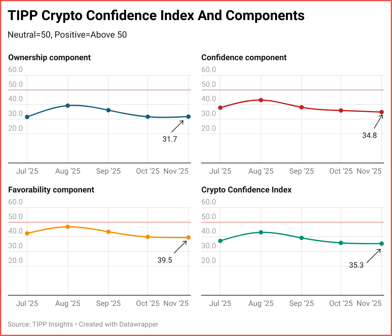 Confidence in Bitcoin’s future remains firm. TIPP has developed the Crypto Confidence Index to track sentiment toward digital assets on a monthly basis. The Index consists of three components: ownership, confidence, and favorability; each is measured on a 0-to-100 scale, with 50 representing the neutral mark.