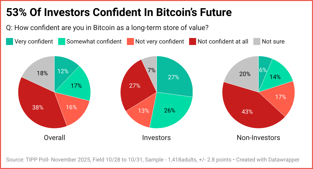 More than half of investors (53%) express confidence in Bitcoin’s long-term potential as a store of value. Among the general public, skepticism persists. People may not buy Bitcoin, yet they now believe it will endure.
