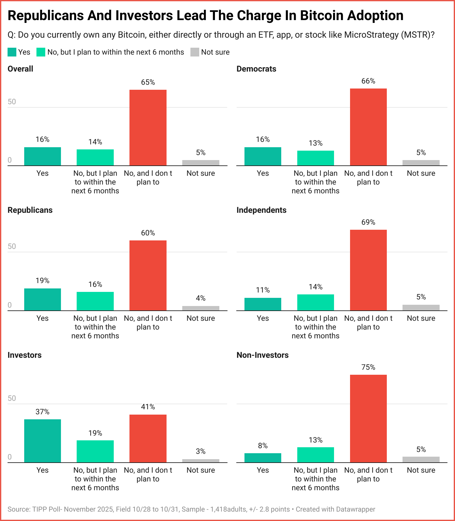 About 16% of adults report owning Bitcoin either directly or through an ETF, and another 14% say they plan to buy within six months. Among investors, ownership reaches 37%, and another 19% plan to purchase it soon.
