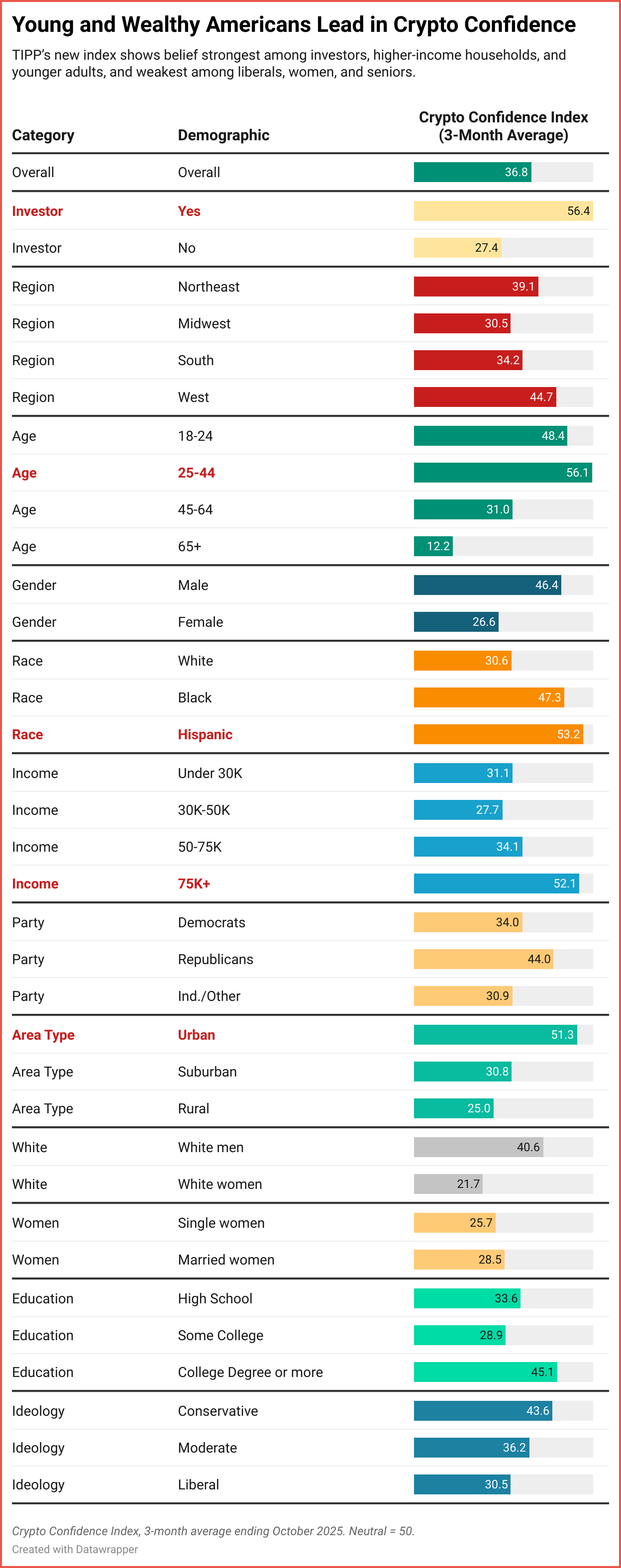 The latest TIPP Crypto Confidence Index data reveal sharp contrasts beneath the national averages. Confidence runs strongest among younger adults, higher-income households, investors, and conservatives, while it remains weakest among liberals, women, and seniors. The table below shows how different demographic groups compare on the three-month average index.