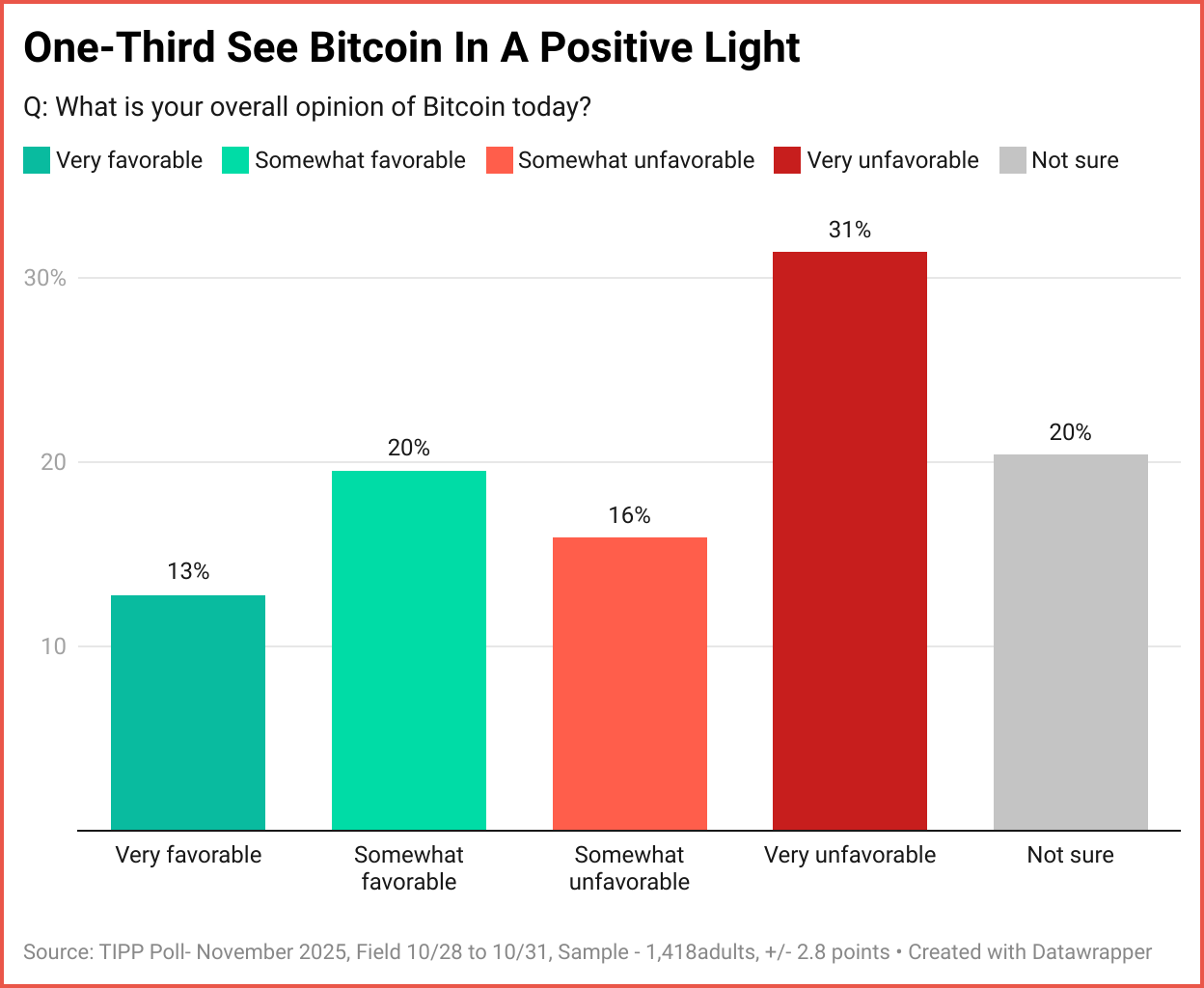 A TIPP Poll of 1,418 Americans completed on Friday shows that one in three (33%) view Bitcoin favorably. Roughly half remain neutral or negative, but the deep hostility that once surrounded crypto is easing.