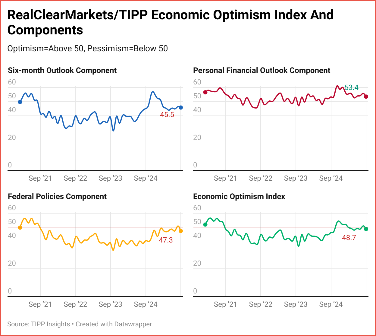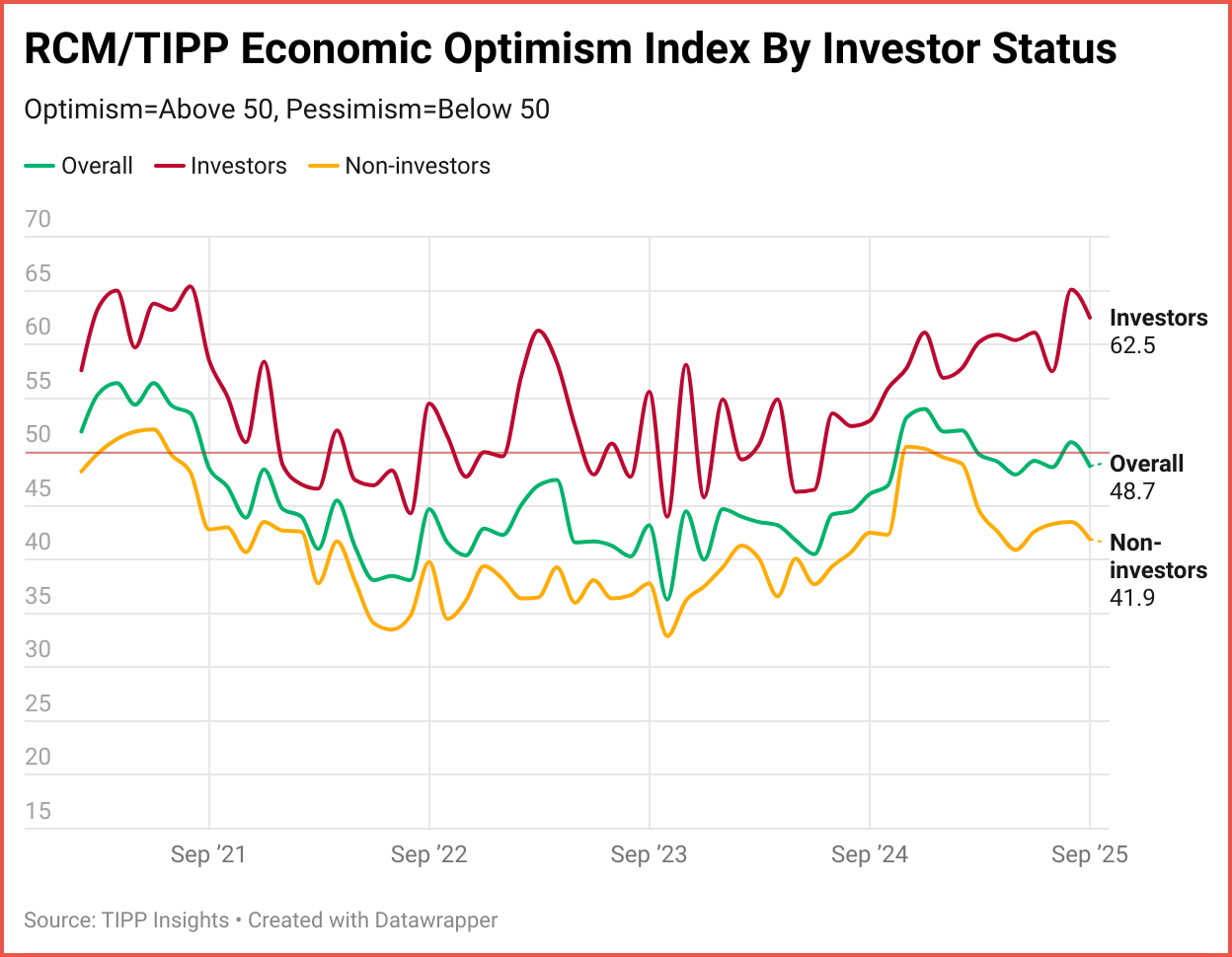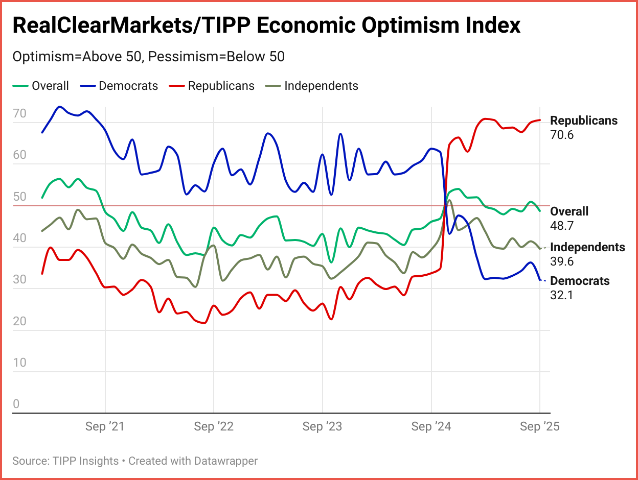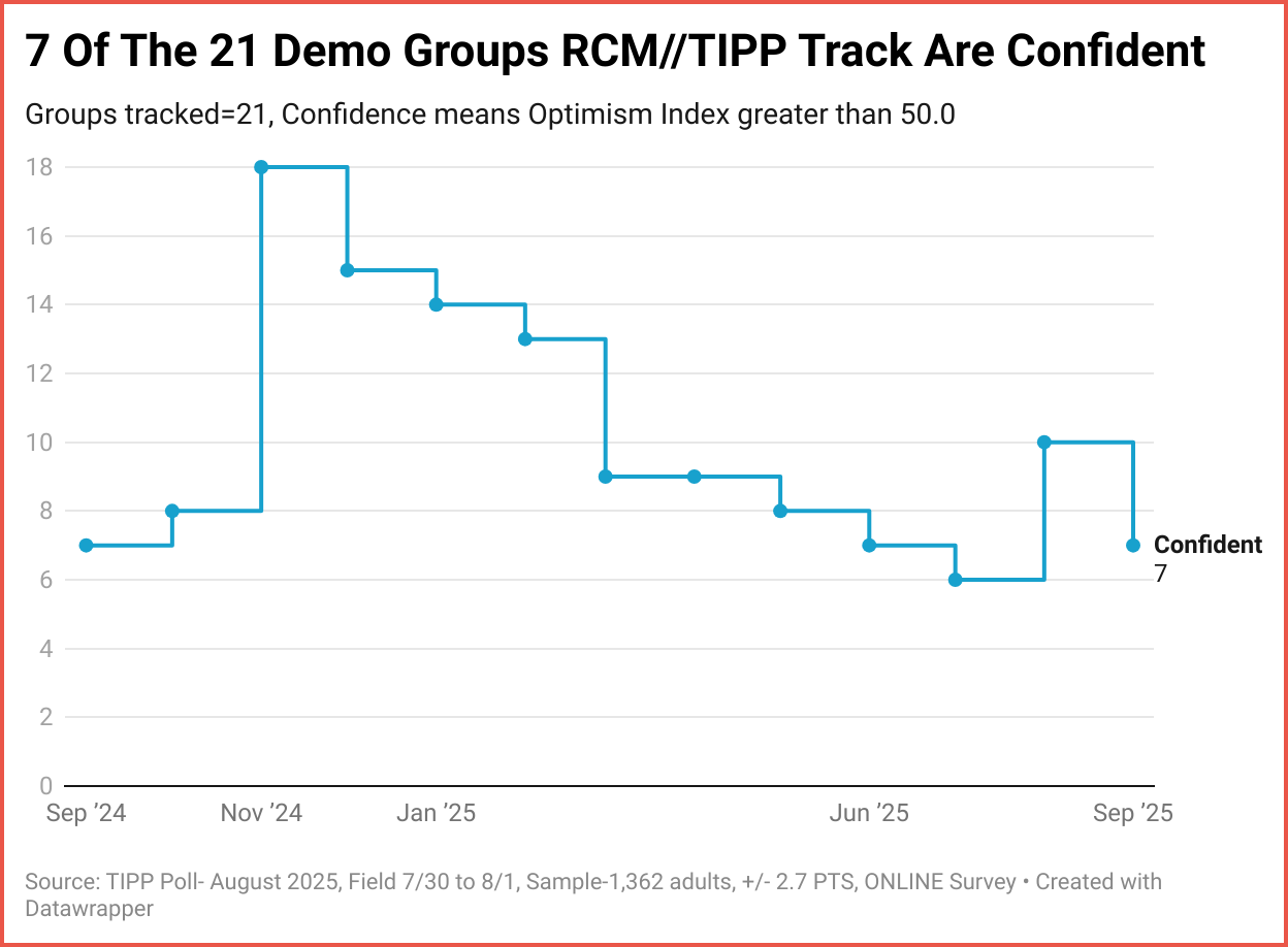 RCM/TIPP surveyed 1,362 adults from August 27 to 29 for the September index, using TIPP’s panel network; results have a range of 0–100, with readings above 50 indicating optimism, below 50 signaling pessimism, and 50 considered neutral. A more detailed methodology is available here.