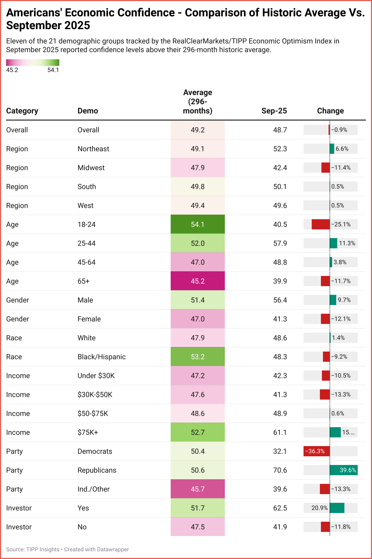 Economic optimism levels for 11 of 21 demographic groups are higher in September 2025 than the historical average of the 296 months, since we began tracking in February 2001.