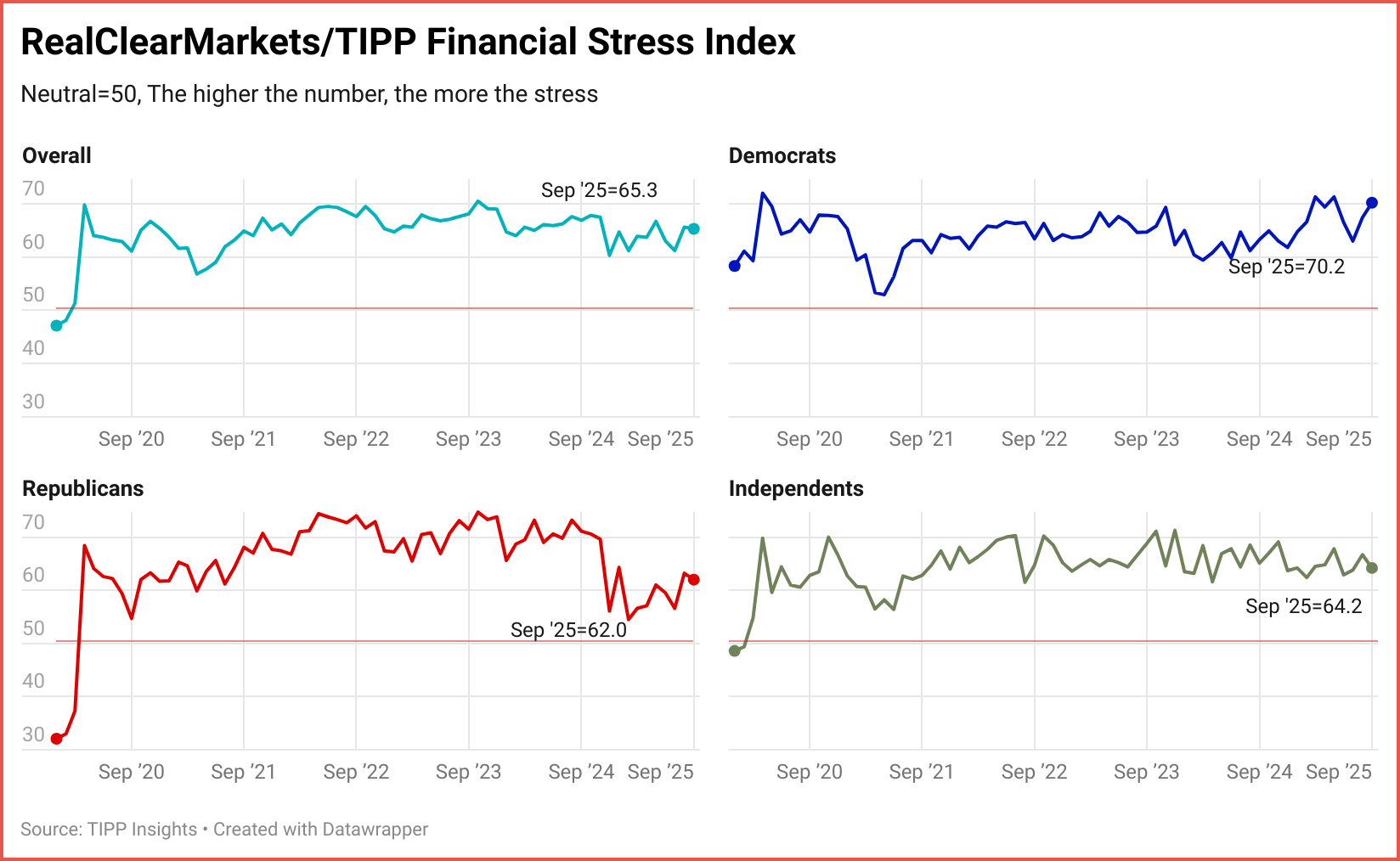 The RCM/TIPP Financial-Related Stress Index dropped 0.3 points (0.5%) from 65.6 in August to 65.3 in September, echoing a slight easing of financial stress among Americans. This reading is still 8.1% above the long-term average of 60.4, underscoring elevated financial strain. The last time the index posted below 50.0 was before the onset of the pandemic in February 2020, when it stood at 48.1.
