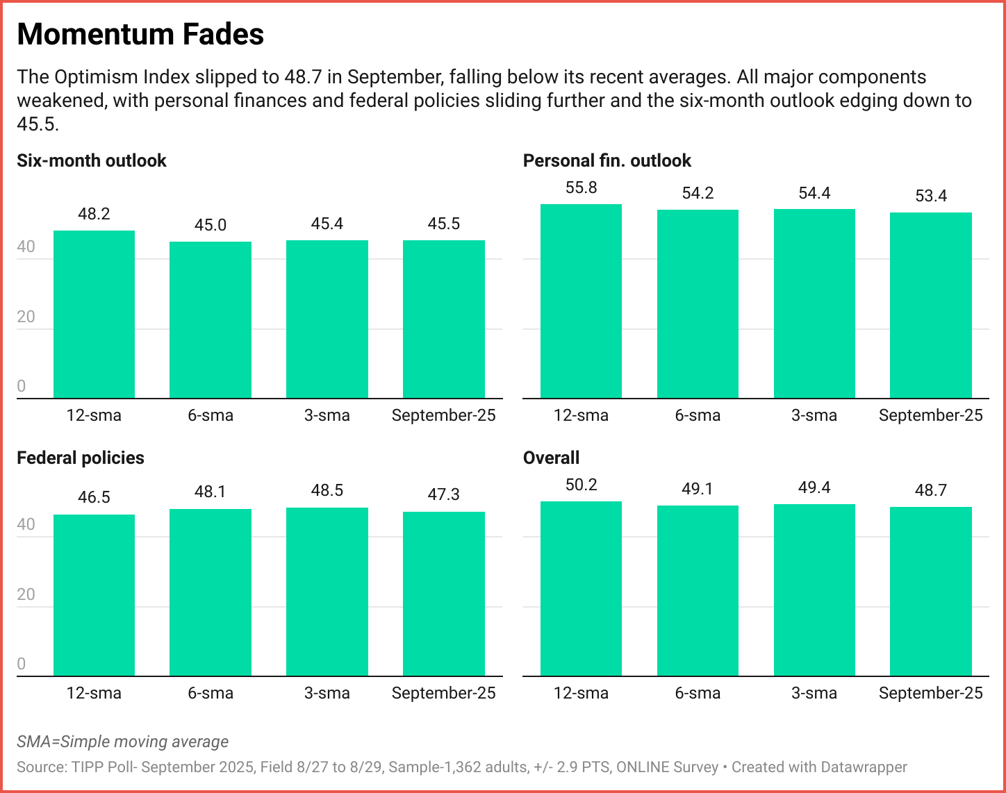 The Optimism Index slipped to 48.7 in September, below its three-month average of 49.4. The Six-Month Outlook held at 45.5, a notch above its three- and six-month benchmarks but still short of its long-term trend. Personal finances eased to 53.4, under both its three- and six-month averages, while confidence in federal policies fell to 47.3, beneath its recent short-term marks though modestly above its 12-month average. Unlike August’s across-the-board rebound, September shows mixed signals, with only the outlook component holding steady while other measures softened.