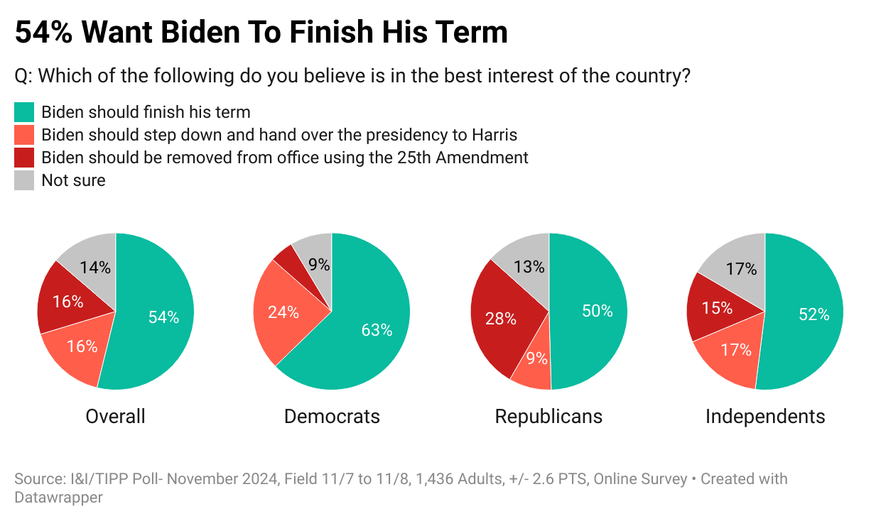 Both before the November 5 presidential election and after, there's been plenty of talk about President Joe Biden stepping down and making Vice President Kamala Harris America's first female president. Despite ardent backing from Democratic Party stalwarts, the idea isn't a popular one, as the latest I&I/TIPP poll indicates.