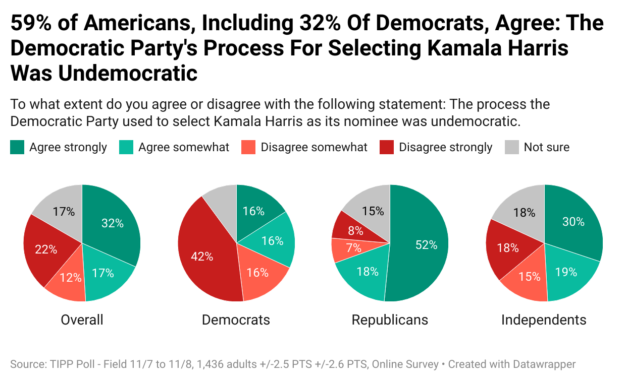 As for the idea that Biden should resign to let Harris make history, if only for less than three months, only 24% of Dems support the idea, while 9% of Republicans and 17% of independent and third-party voters agree.