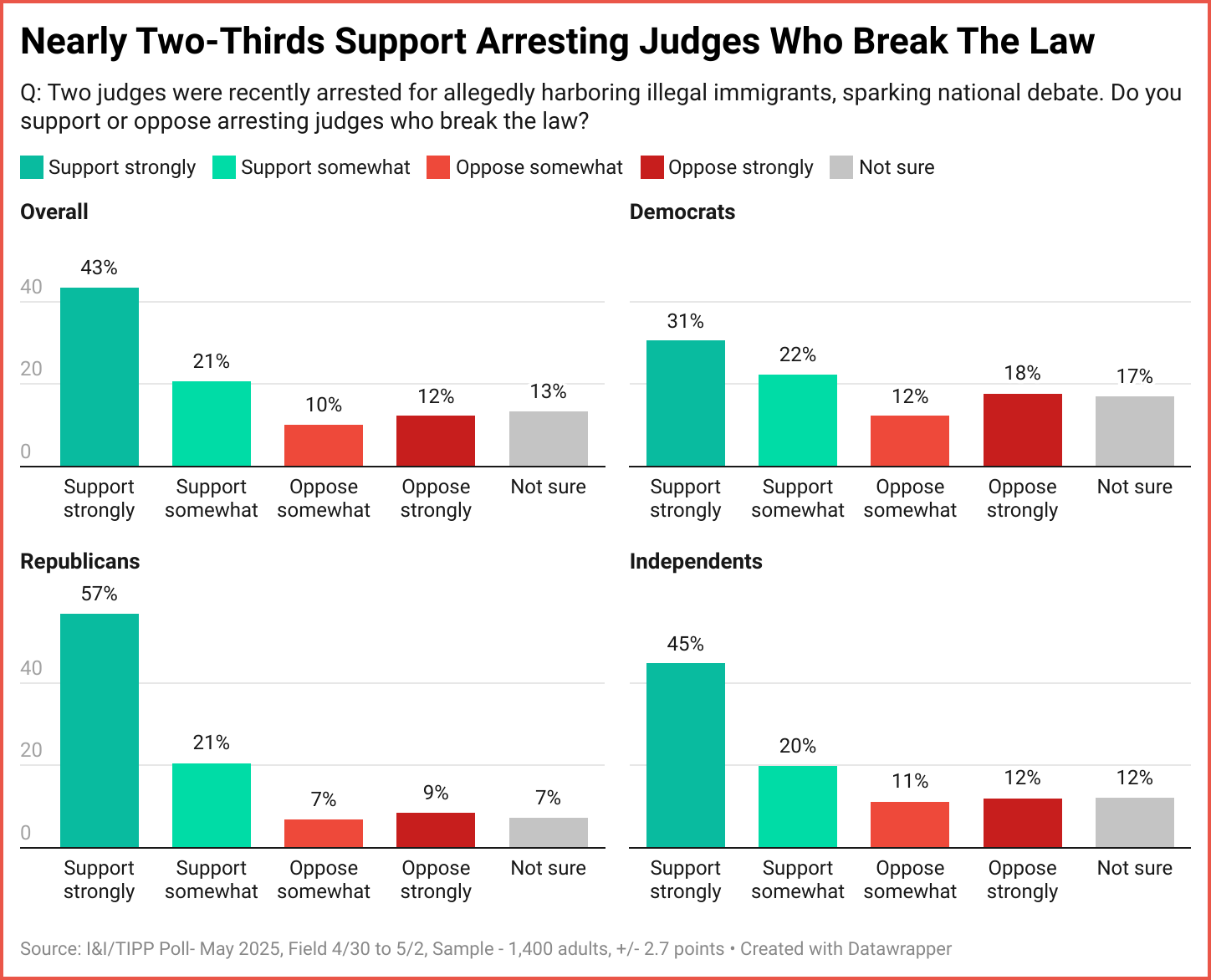 Overall, 64% said they supported arresting judges who break laws either "strongly" (43%) or "somewhat" (21%). Just 22% opposed the idea, 10% "strongly" and 12% "somewhat."