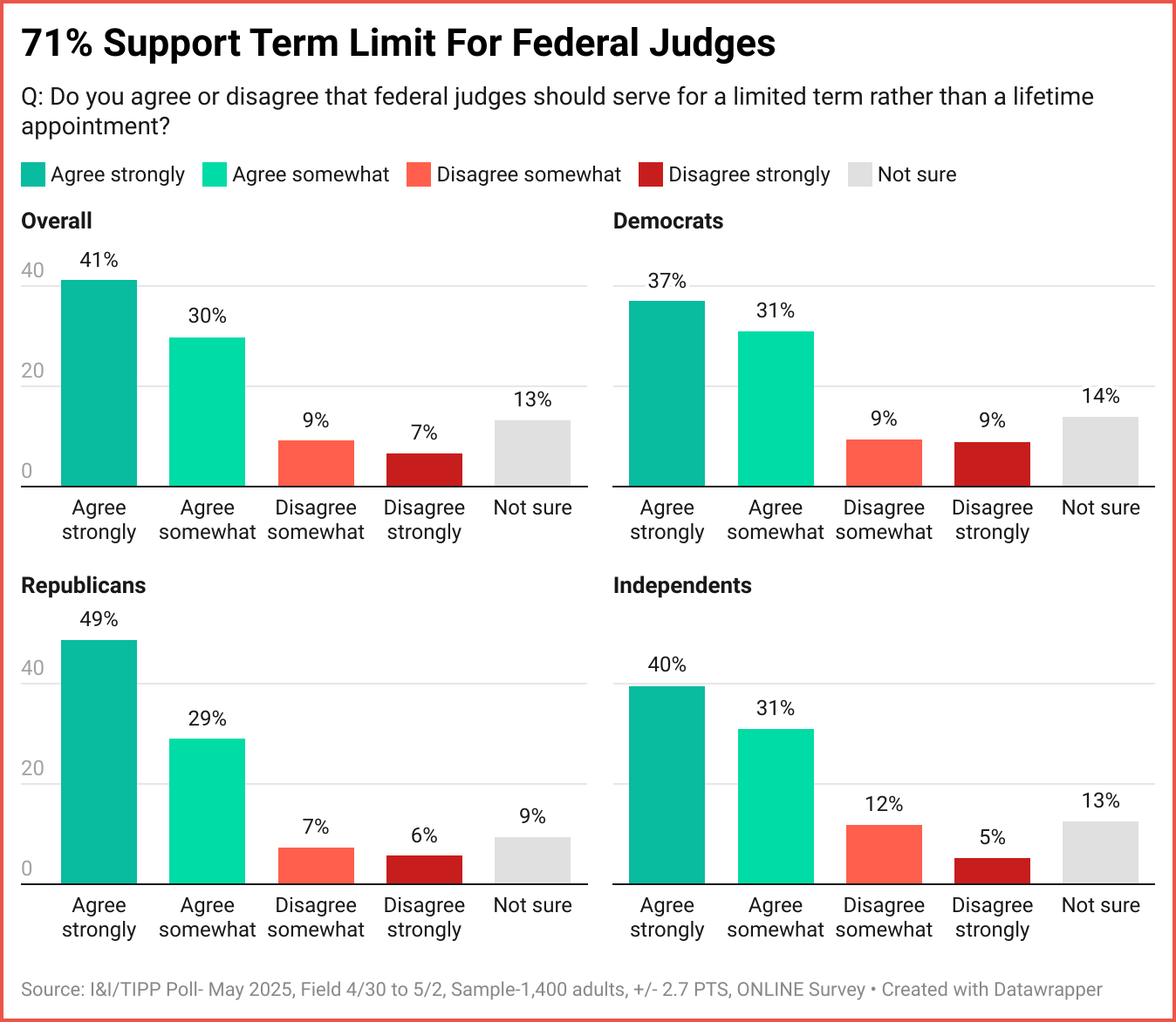 Among Democrats, 68% agreed to term limits for federal judges, while 18% disagreed. Independents were slightly higher at 71% agree, 17% disagree. Republicans were highest of all at 78% agree, 13% disagree.