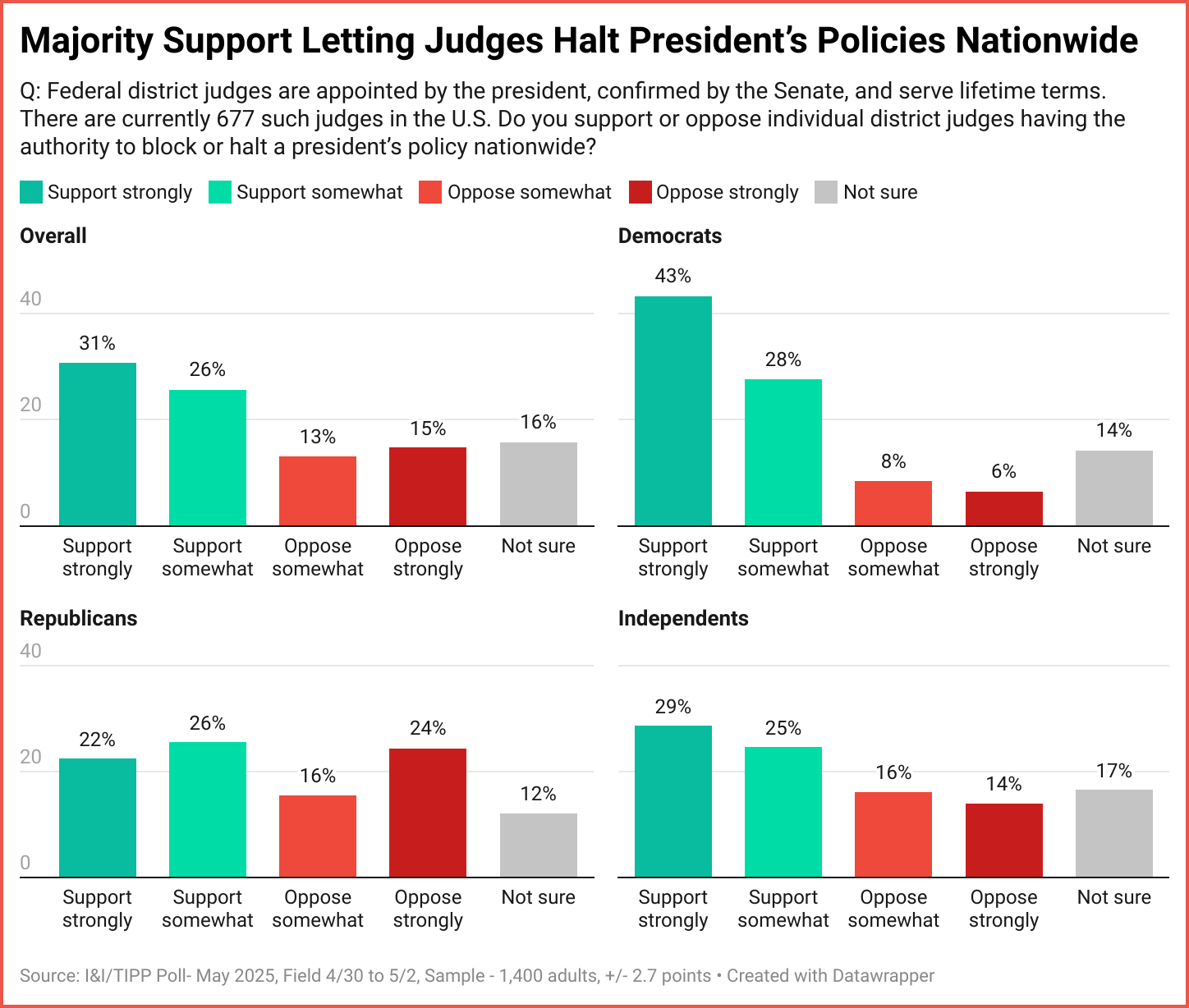 In its April 30-May 2 national online poll of 1,400 voters, I&I/TIPP posed the following statement and question: "Federal district judges are appointed by the president, confirmed by the Senate, and serve lifetime terms. There are currently 677 such judges in the U.S. Do you support or oppose individual district judges having the authority to block or halt a president’s policy nationwide?"