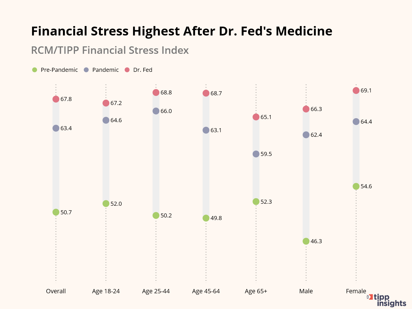 The chart below presents the averages of the RCM/TIPP Financial Stress Index for the three periods. We present the data for overall, four age groups, and two genders.