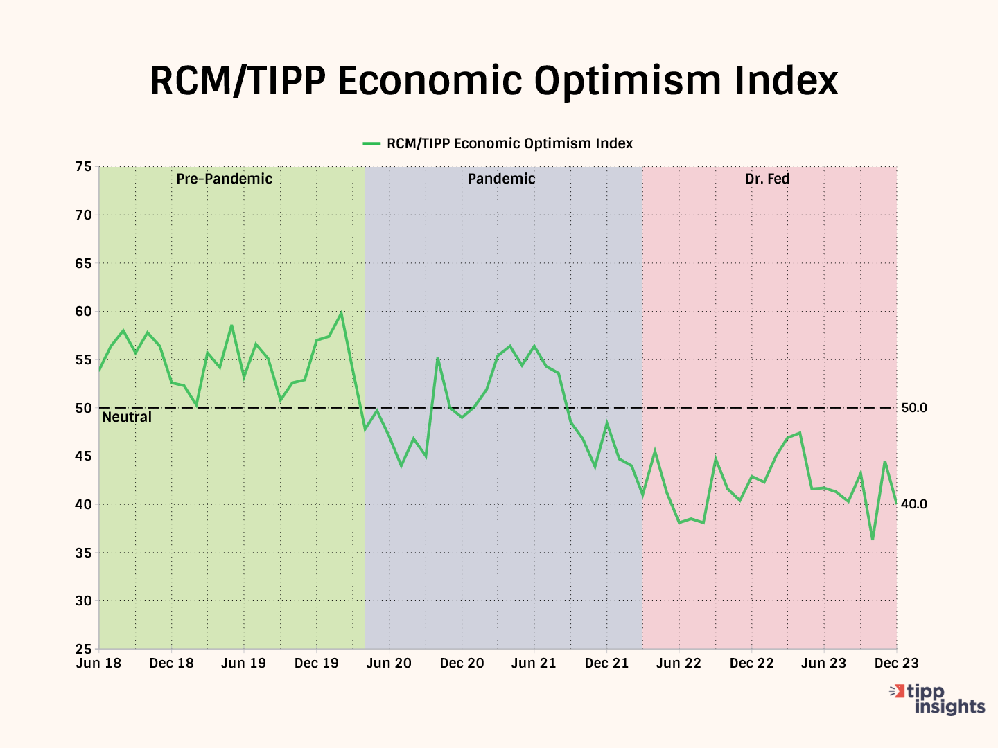 RCM/TIPP index readings above 50.0 signal optimism, and readings below 50.0 indicate pessimism.