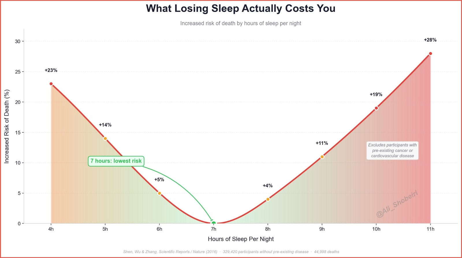 Research suggests a U-shaped relationship between sleep and mortality risk, with roughly seven hours per night associated with the lowest risk. Both short and long sleep durations correlate with higher health risks, reinforcing the importance of sleep balance rather than extremes.