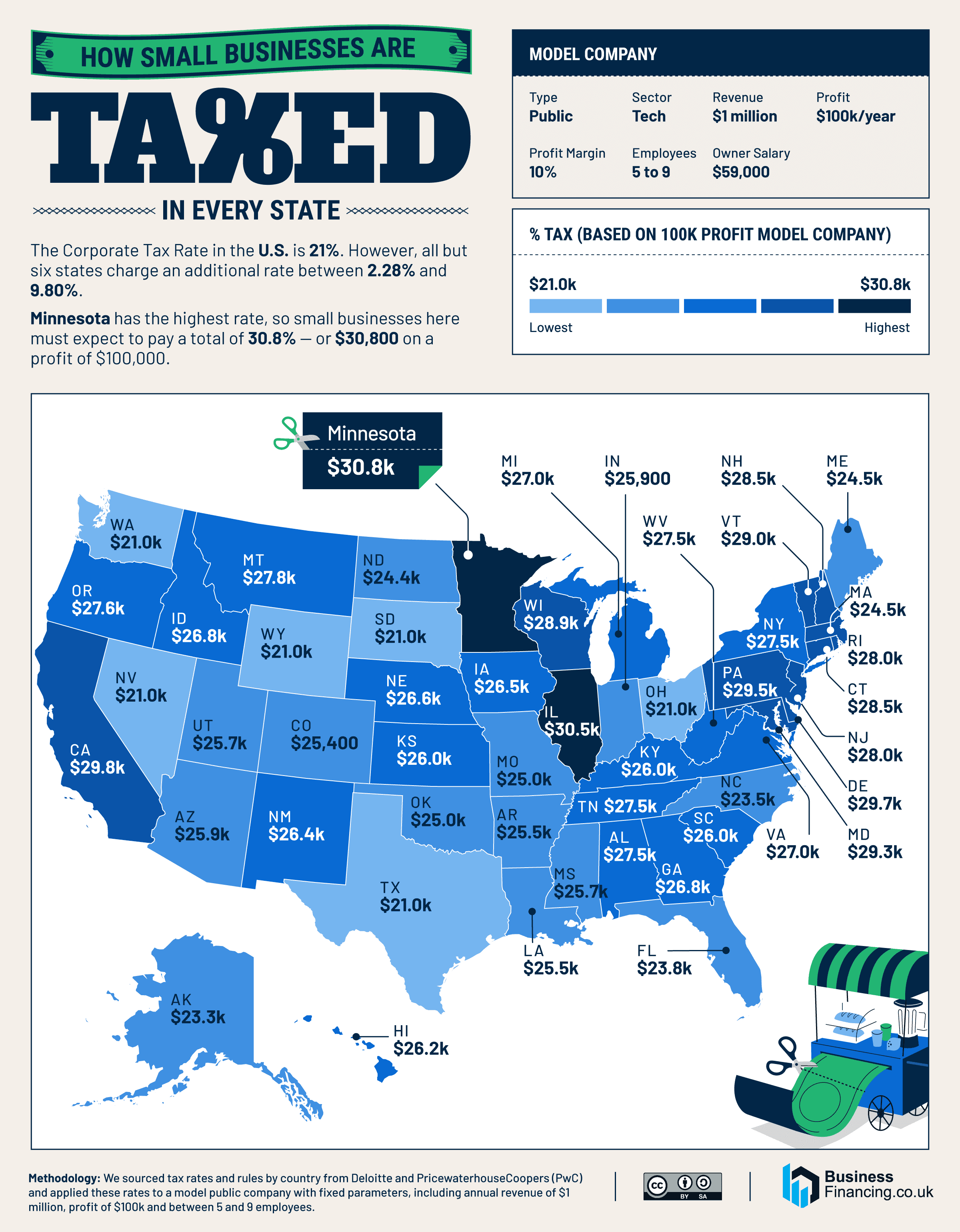 A small business earning $100,000 in profit can face tax bills ranging from roughly $21,000 to over $30,000 depending on the state, highlighting major differences in tax burdens across the country.
