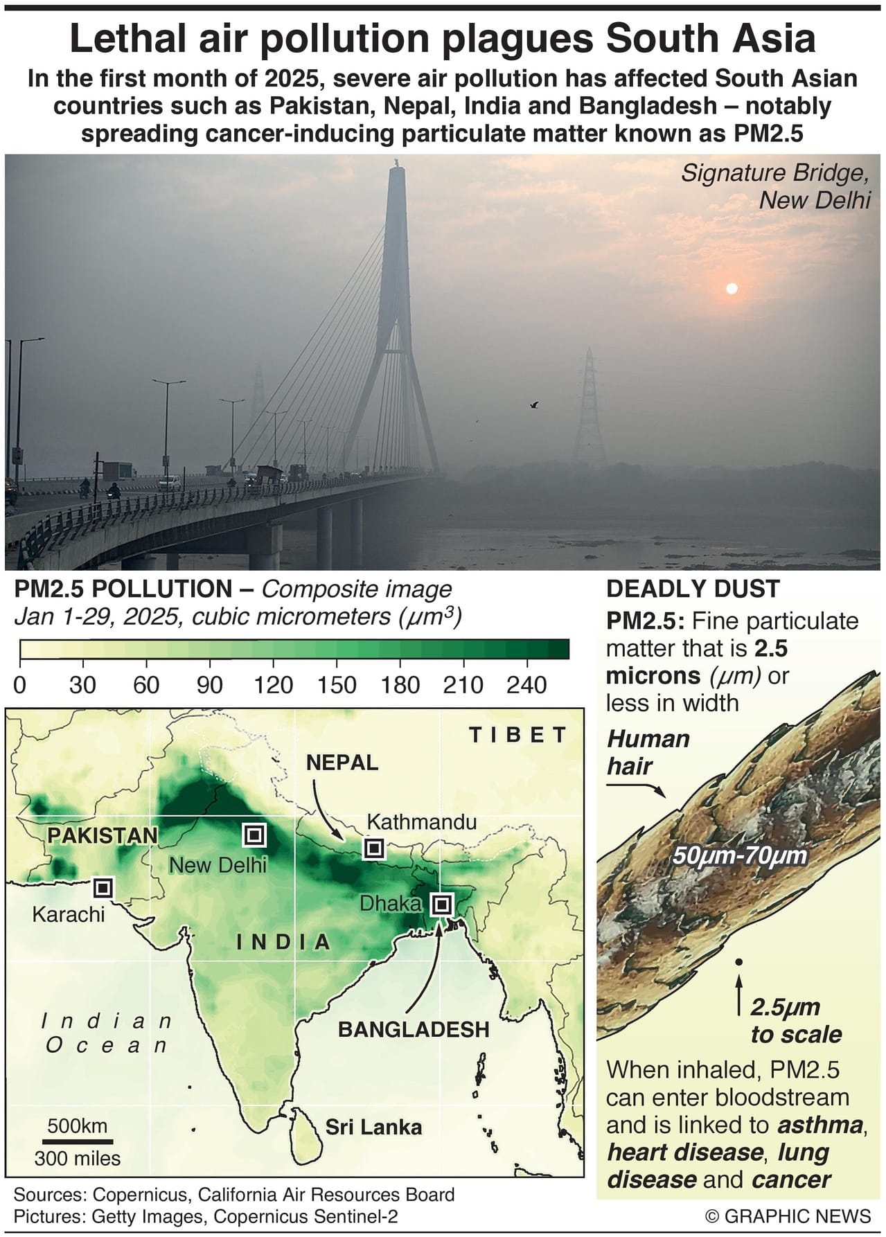 In the first month of 2025, severe air pollution has affected South Asian countries such as Pakistan, Nepal, India and Bangladesh – notably spreading cancer-inducing particulate matter known as PM2.5.