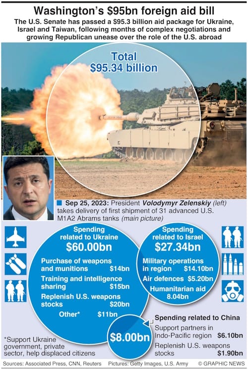 Some senators voted for the bill because the money would be spent in their home districts to rebuild America's weapons inventory. Others voted their conscience by saying that Putin's aggression should and must be punished. Still others unbelievably insisted that if America did not stop Putin, he would next attack a NATO country—a far stretch from the truth. [Putin has never said he would strike a NATO country. In his interview with Tucker Carlson, he said he floated the idea of becoming part of NATO but was rebuffed by the West. Besides, Russia is too weak to engage with NATO - it has barely been able to hold ground against an inferior fighting force in Ukraine.]