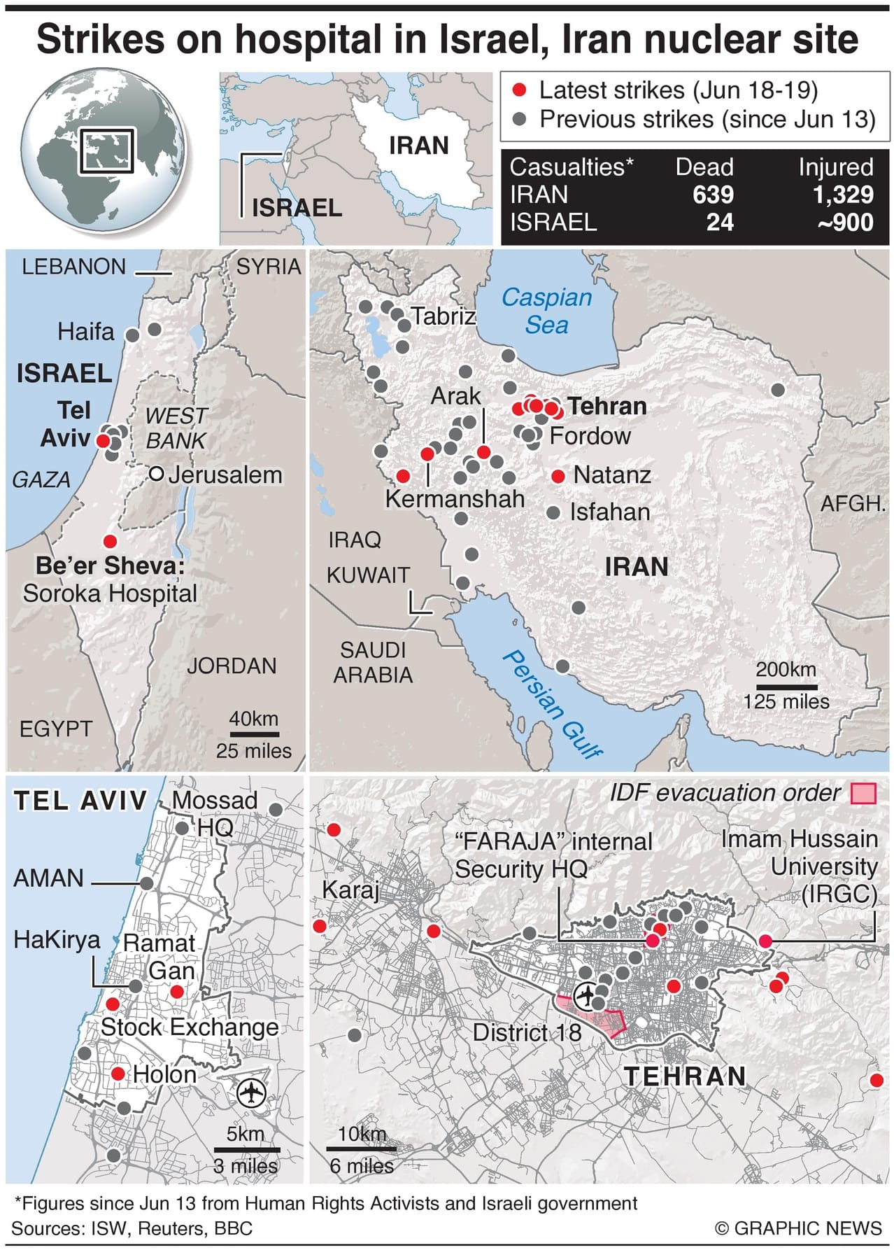 Iranian missiles made a direct hit on a hospital in southern Israel and residential buildings near Tel Aviv, while Israeli airstrikes targeted the Arak heavy water reactor and the Natanz nuclear facility.
