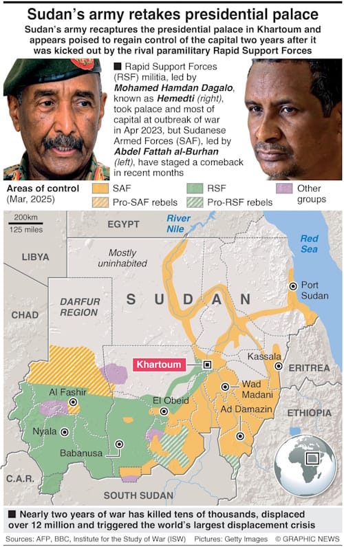 Sudan’s army has retaken the presidential palace in Khartoum, and appears poised to regain control of the capital two years after it was kicked out by the rival paramilitary Rapid Support Forces.