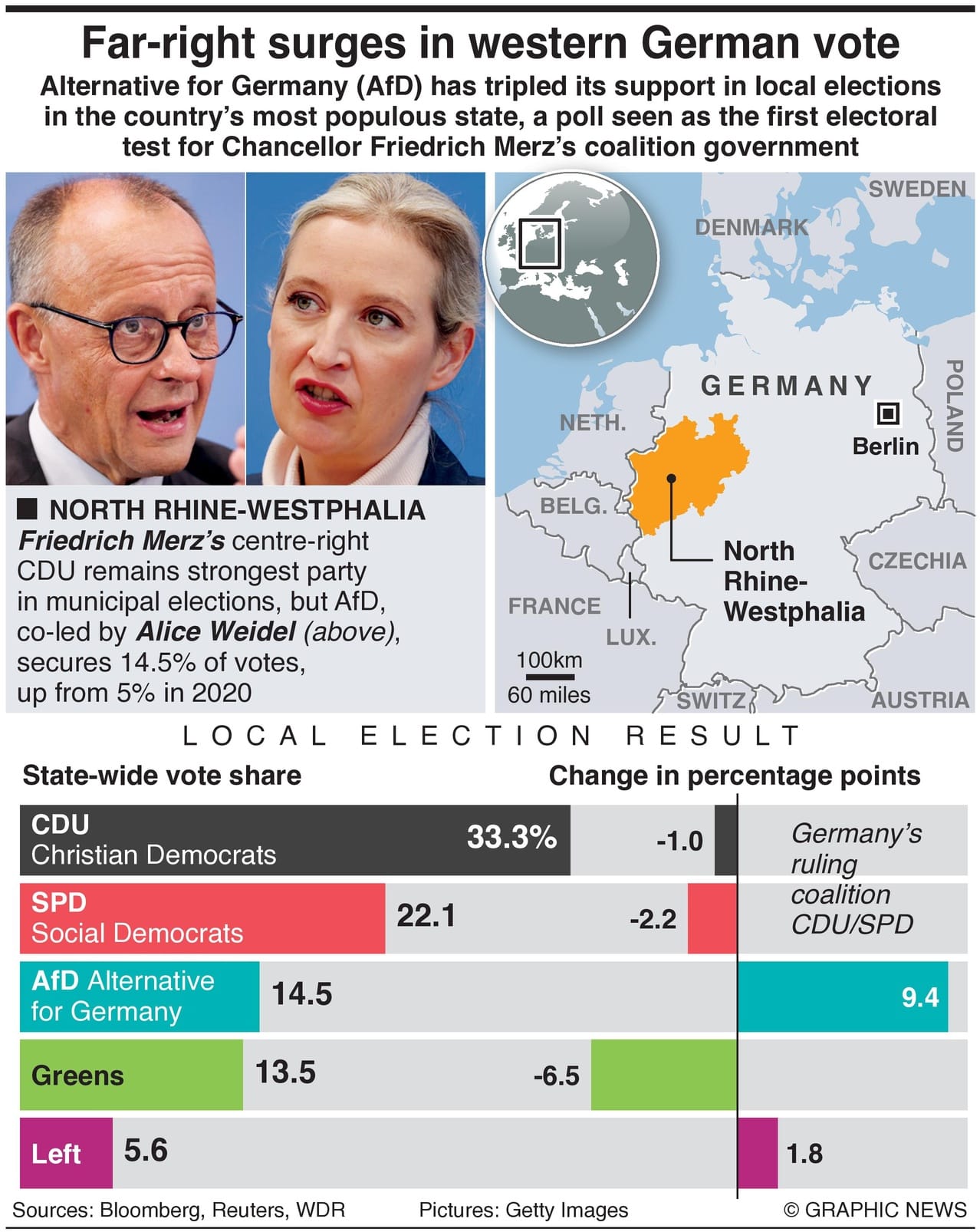 Alternative for Germany (AfD) has tripled its support in local elections in the country’s most populous state, a poll seen as the first electoral test for Chancellor Friedrich Merz’s coalition government.