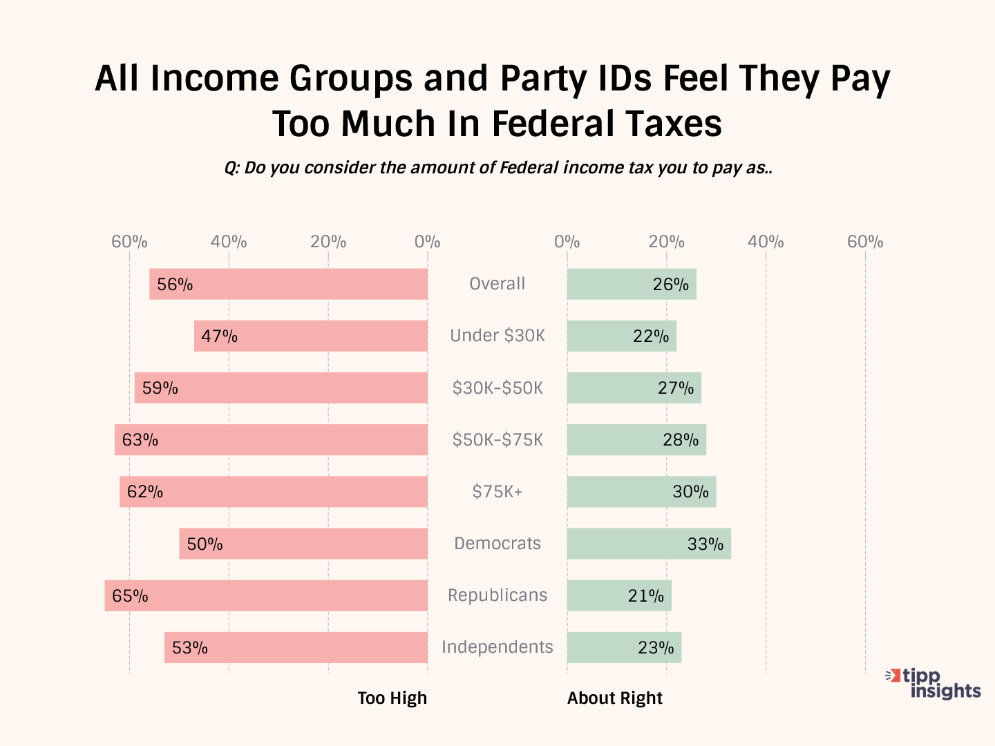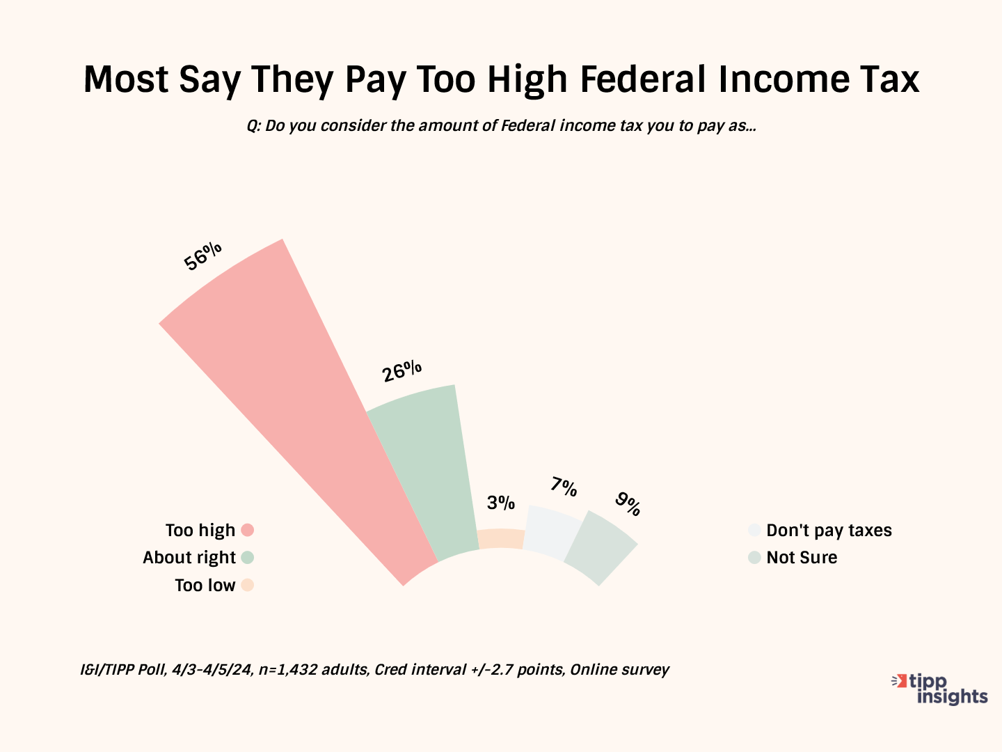 Specifically, the online national I&I/TIPP Poll of 1,432 voters asked the following question: “On the topic of taxes, do you consider the amount of federal income tax you pay as …”, followed by five possible answers: “Too high,” “about right,” “too low,” “don’t pay taxes,” and “not sure.” The poll, taken from April 3-5, has a +/-2.7 percentage point margin of error.