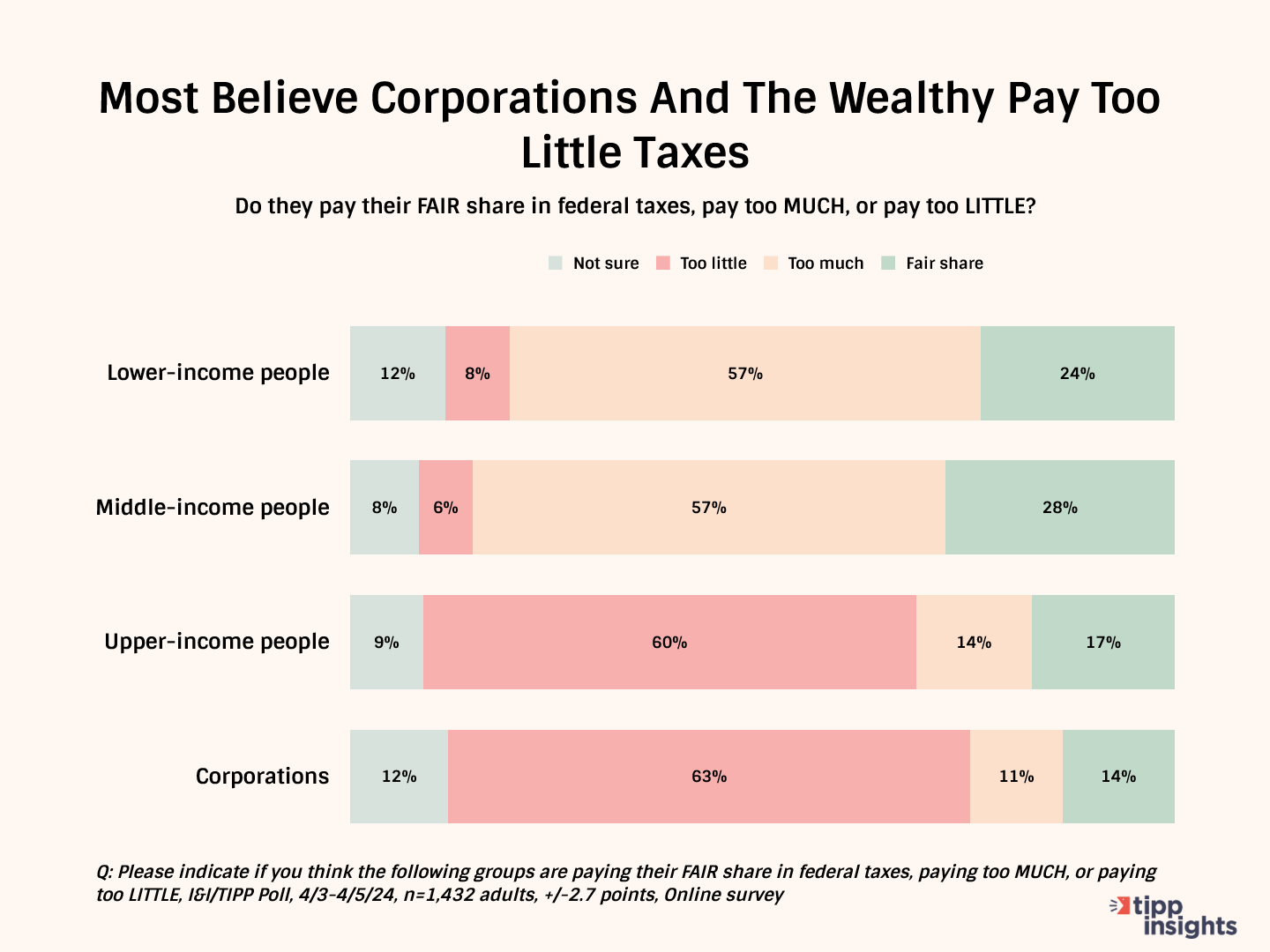 We asked a follow-on question: “Please indicate if you think the following groups are paying their fair share in federal taxes, paying too much, or paying too little.” The choices included “lower-income people,” “middle-income people,” and “upper-income people” and “corporations.”