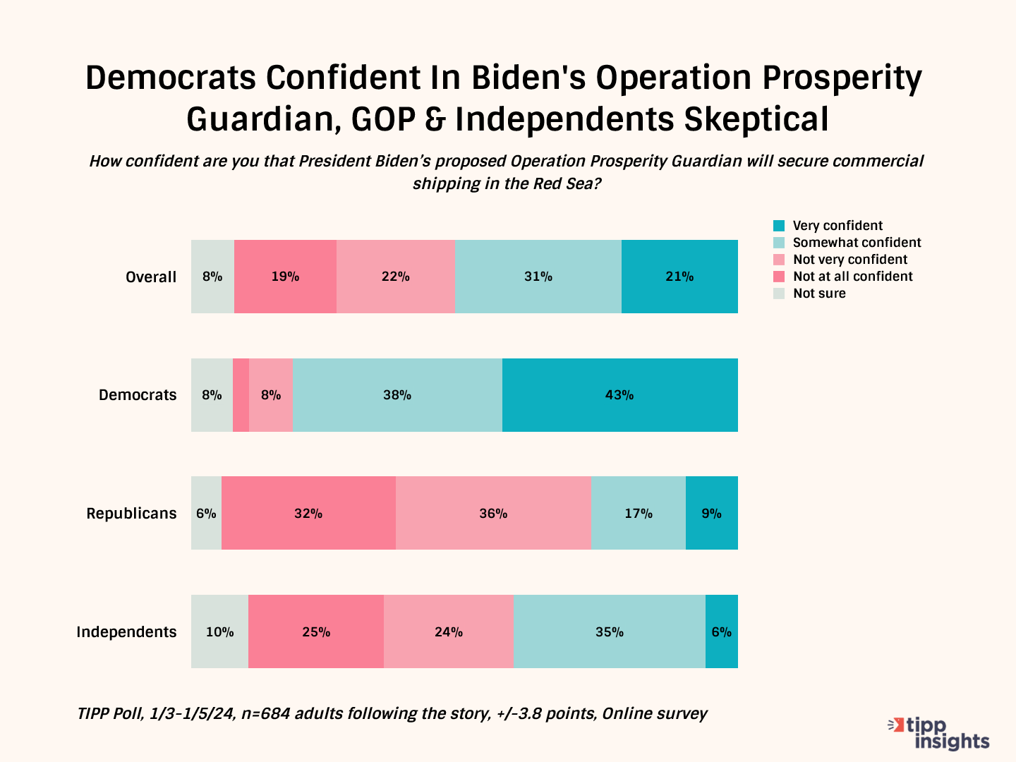 Democrats were significantly more confident, with 81% responding positively and only 11% disagreeing. But the numbers for the other political groups tell a different story: Only 26% of Republicans and 41% of independents said they have a degree of confidence in Operation Prosperity Guardian, compared to 68% and 49%, respectively, who said they don’t.