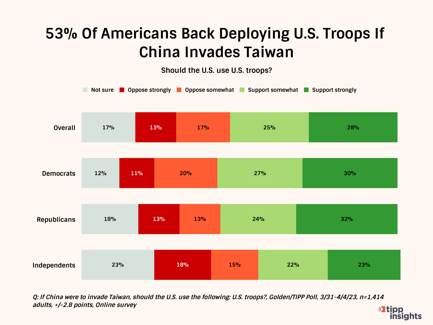 If China were to invade Taiwan, three-fourths support economic sanctions; a majority, 53 percent, support using U.S. troops. 28% “support strongly,” and another 25% “support somewhat.” While 57% of Democrats and 56% of Republicans support using U.S. troops, 45% of independents do so.