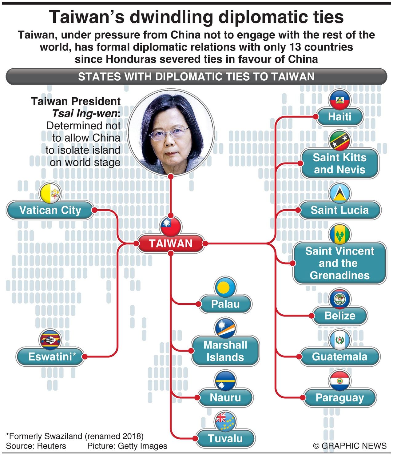 Taiwan, under pressure from China not to engage with the rest of the world, has formal diplomatic relations with only 13 countries since Honduras severed ties in favour of China.