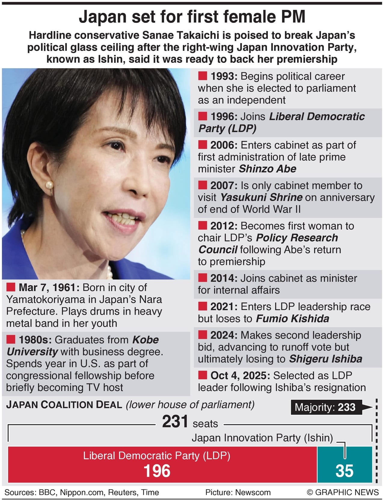 Sanae Takaichi is on track to become Japan's first female prime minister, after the right-wing Japan Innovation Party, known as Ishin, said it was ready to back her premiership.