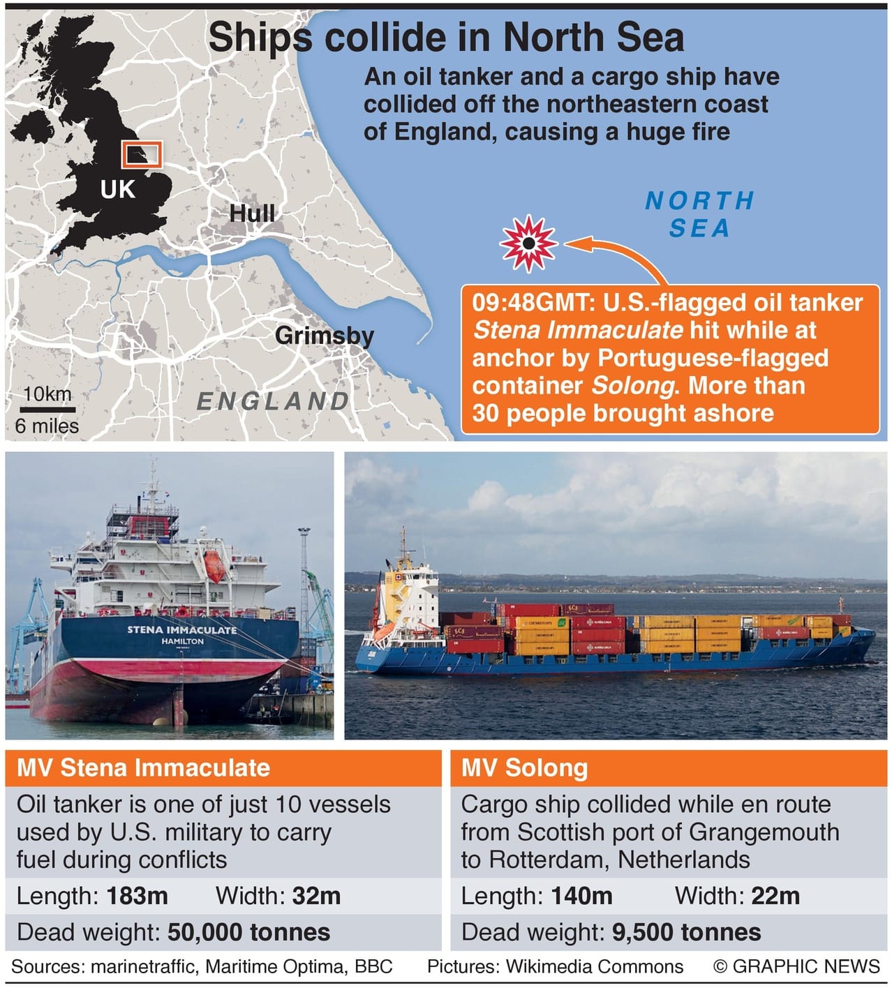 A tanker and container ship have collided off the northeastern coast of England, causing a huge fire on at least one of the vessels and leading to numerous casualties.