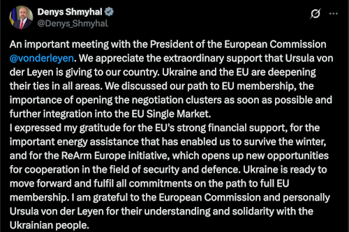 Ukrainian Prime Minister Denys Shmyhal emphasized Thursday that any minerals agreement with the U.S. must not undermine Ukraine’s bid to join the European Union.