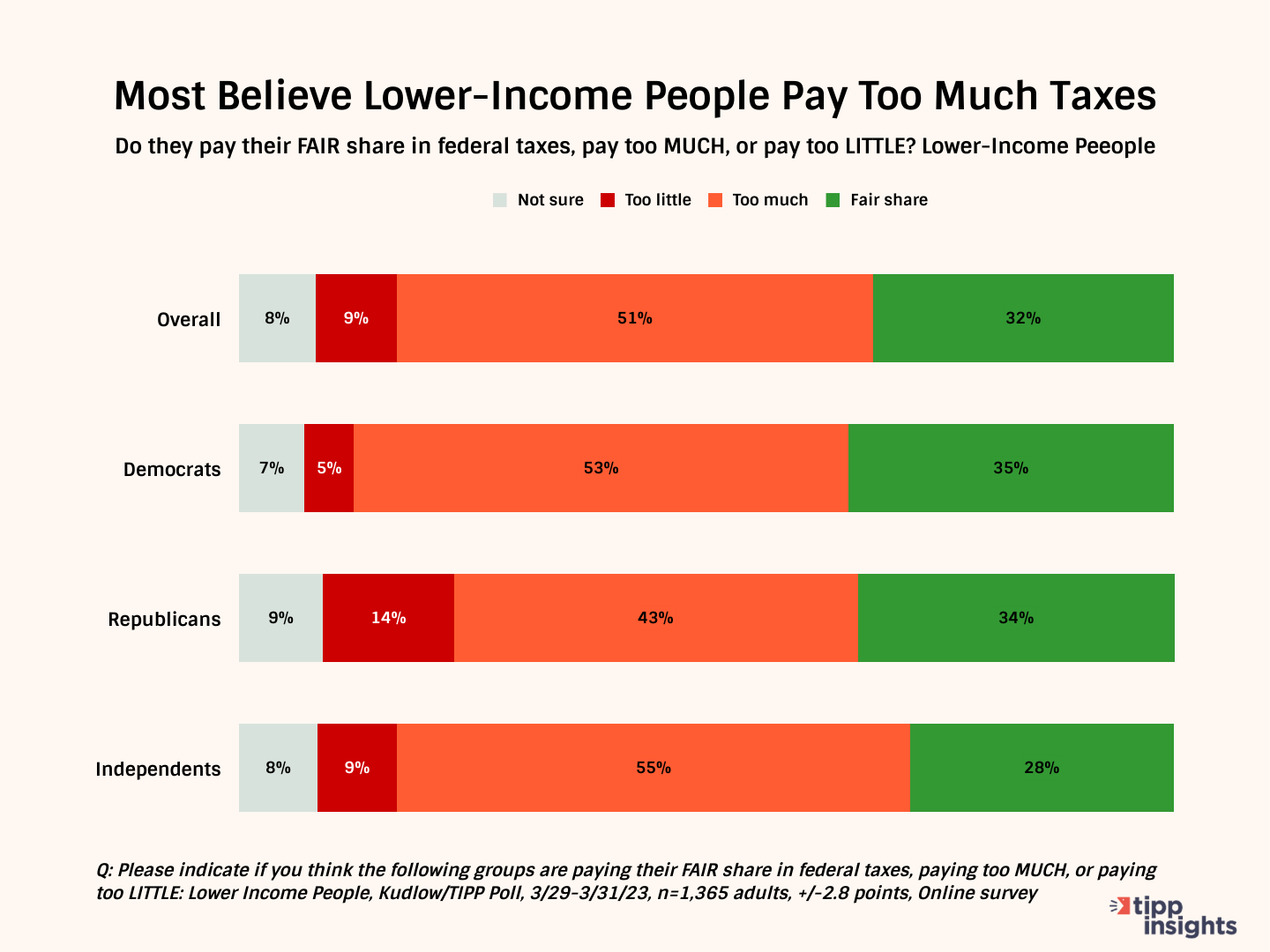 Most Americans (51%) believe that lower-income people pay too much in taxes, 32% think they pay their fair share, and 9% say they pay too little.