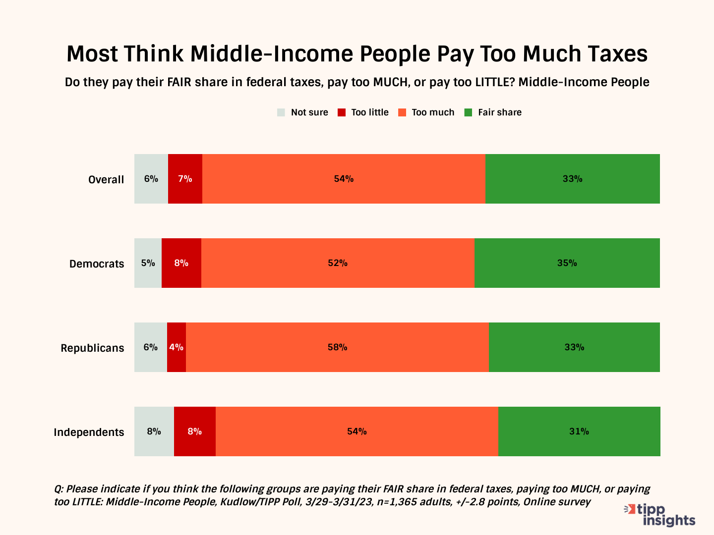 By party affiliation, 52% of Democrats, 58% of Republicans, and 54% of independents think middle-income earners pay too much.