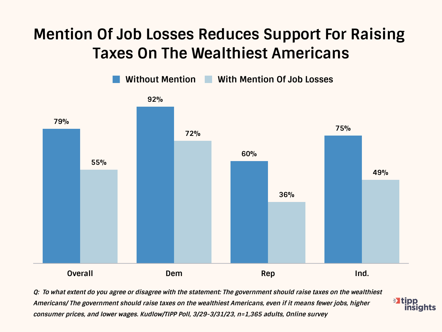 When the potential impact was mentioned, independents showed the highest movement in dropping support of raising taxes on the wealthy. They dropped from 75% to 49%, a 26-point decline.