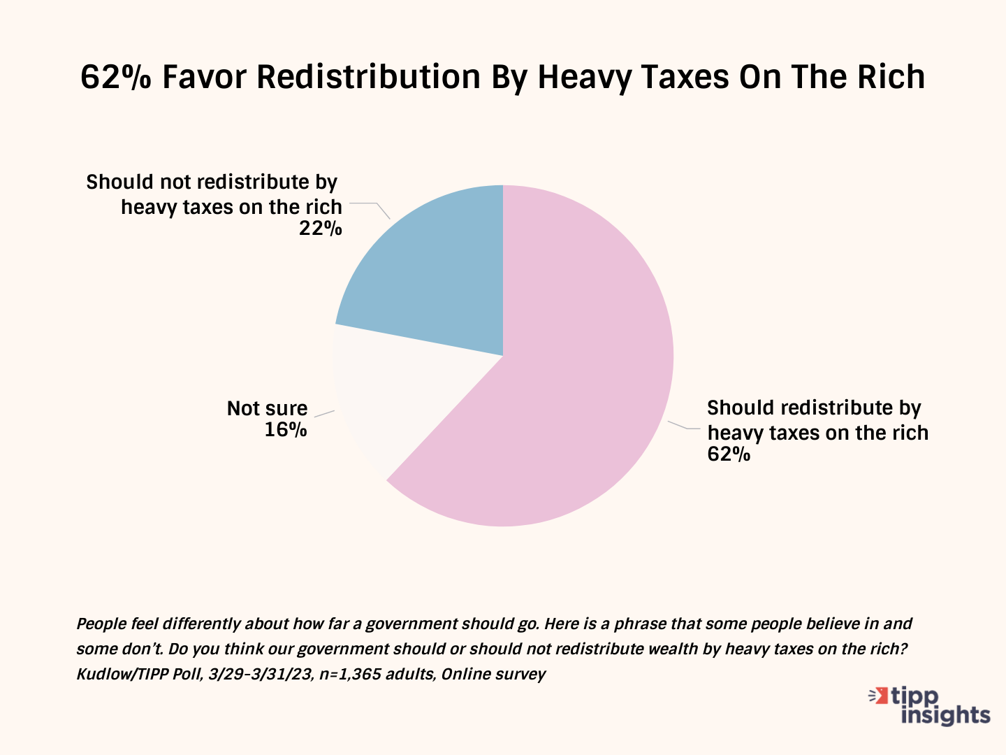 Six in ten Americans, or 62%, believe the government should redistribute wealth by heavily taxing the rich. Meanwhile, 22% think the government should not, and 16% are unsure.